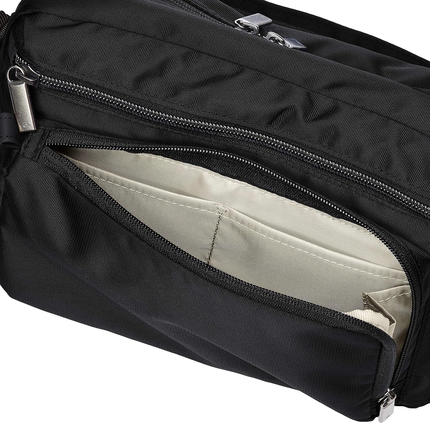 外側に2つ、メイン(内側にもファスナー付、ポケット2)、のファスナーが付いており、また、身体側にも1つ。
