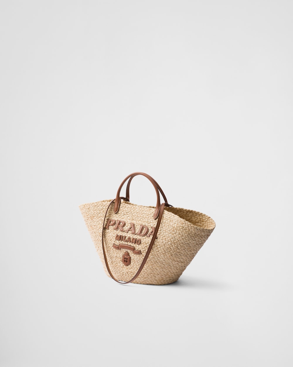 ラフィアとレザーのディテールを組み合わせて夏らしいムードに仕上げた、モダンで洗練されたトートバッグ。コントラストの効いたレタリングロゴがフロントにあしらわれた収納力のあるアイテム。ダブルハンドルが備わっているので、手で持つことも肩にかけることもできます。