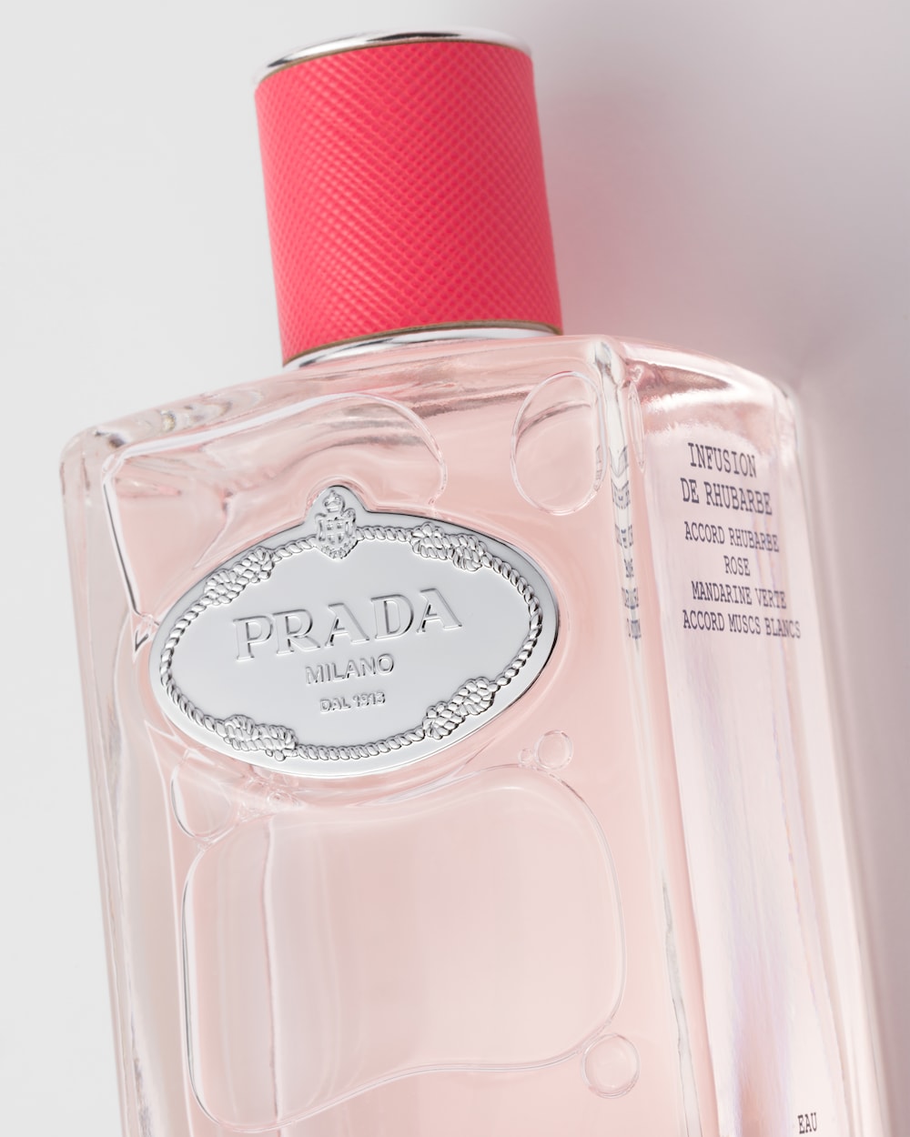 インフュージョン ドゥ ルバーブ オーデパルファムは、ピンクとグリーンの意外性のあるフローラルフルーティなフレグランスにルバーブの遊び心あふれるパーソナリティを取り入れ、甘くアシッドな香りに仕上げています。野菜でありながらフルーティなトーンで定評のある「ルバーブ」の挑発的でありながら溌剌とした個性が、プラダの表現する個性と馴染み昇華されます。プラダのインフュージョンの精神に込められたルバーブは、フレッシュで控えめ、繊細でアディクティブという、プラダの核となる二元性を表現しています。薄いピンクのフレグランスを、ラグジュアリーなボトルと鮮やかなピンクのアイコニックなサフィアーノレザーのキャップで閉じ込めました。メインの素材にインスパイアされた遊び心あふれるデザインです。