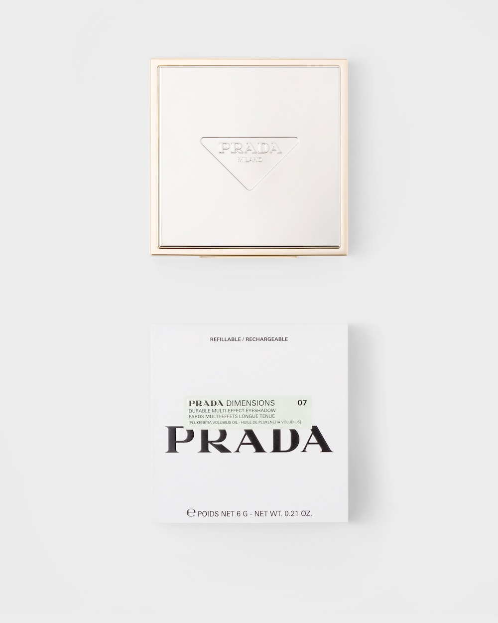 目元を彩る輝きと視線を奪うクチュールカラーホロヌード コレクション (07, 08, 09)使いやすく、引きたてやすいヌーディパレット。透明感あふれるヌーディーカラーと偏光ホログリッターの色合いで上品かつ魅惑的なまなざしを演出。花の脆さと強さの二面性を表現したプラダの2023年秋冬キャンペーンへの着想で生まれた3種のアイパレットです。しっとりまぶたに密着するクリーミーパウダーで、ベース、重ね塗り、陰影付けを自在に。重ねてもよれない、思いのままの目元に導き、色合いが12時間*が続きます。偏光ホログリッターは見る角度によって色が変化し、華やかで奥行きのある目元に彩ります。濡らした状態もしくは乾いた状態で目元に重ねることでより美しい輝きと色の変化をお楽しみください。3種類のフィニッシュ:ソフトマット、サテン、偏光ホログリッターマイクロピクセル テクノロジーハイスピード [1200m/S] ピクセルサイズに極限まで細かく粉砕したピグメント。均一で鮮やかな発色と高密着を実現。グリーンナッツ オイル*均一でなめらかに肌に溶け込み思い通りにブレンド可能。付けていることを忘れるほどの軽さと付け心地。*プラダ ビューティ調べ、個人差あり。*2プルケネチアボルビリス種子油(エモリエント成分)