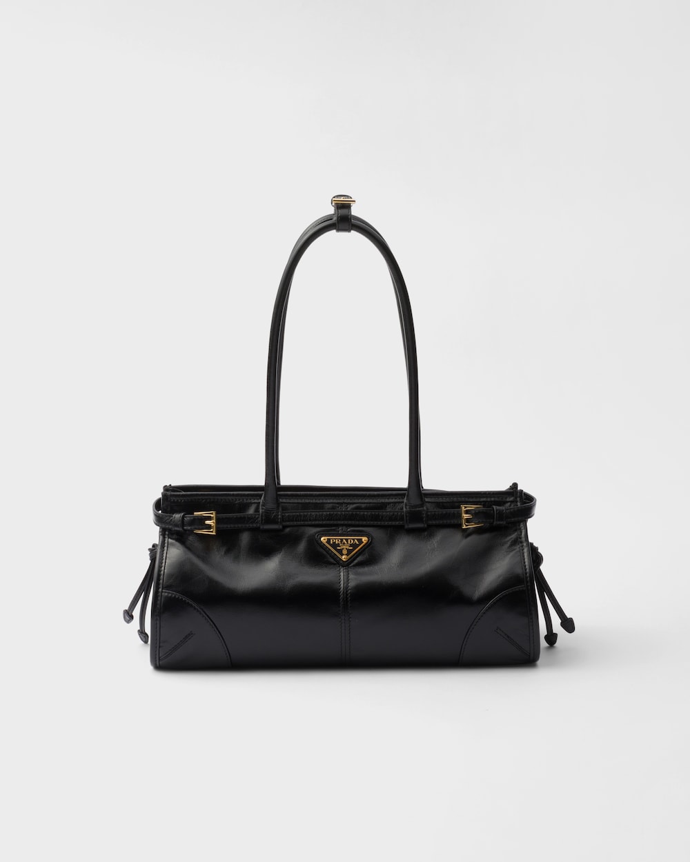 多用途でモダンな魅力を持つ艷やかな仕上がりのソフトレザーを使用した、実用的でエレガントなハンドバッグ。幾何学的なデザインに、多彩な要素が個性的でありながら洗練された美しさで1つのスタイルに融合されています。レクタンギュラーのシルエットに上品なストラップのディテールをあしらい、内側にファスナー付ポケットを配しています。エナメルメタルのトライアングルロゴがプラダらしいアイコニックな魅力を添えています。