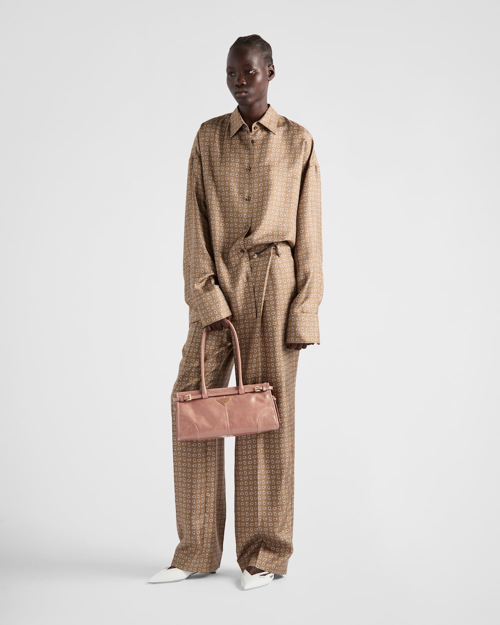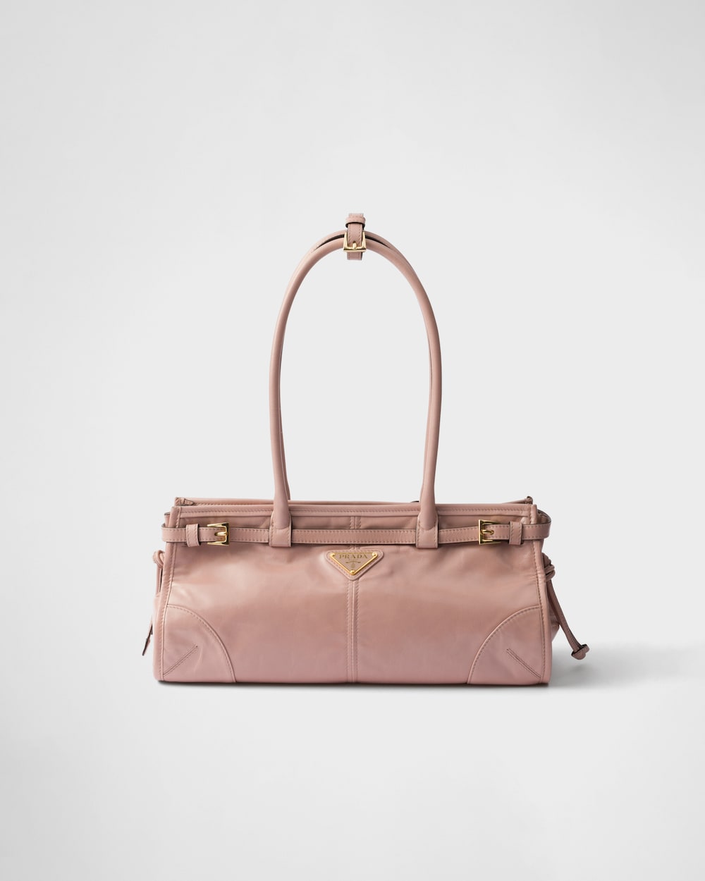 多用途でモダンな魅力を持つ艷やかな仕上がりのソフトレザーを使用した、実用的でエレガントなハンドバッグ。幾何学的なデザインに、多彩な要素が個性的でありながら洗練された美しさで1つのスタイルに融合されています。レクタンギュラーのシルエットに上品なストラップのディテールをあしらい、内側にファスナー付ポケットを配しています。エナメルメタルのトライアングルロゴがプラダらしいアイコニックな魅力を添えています。
