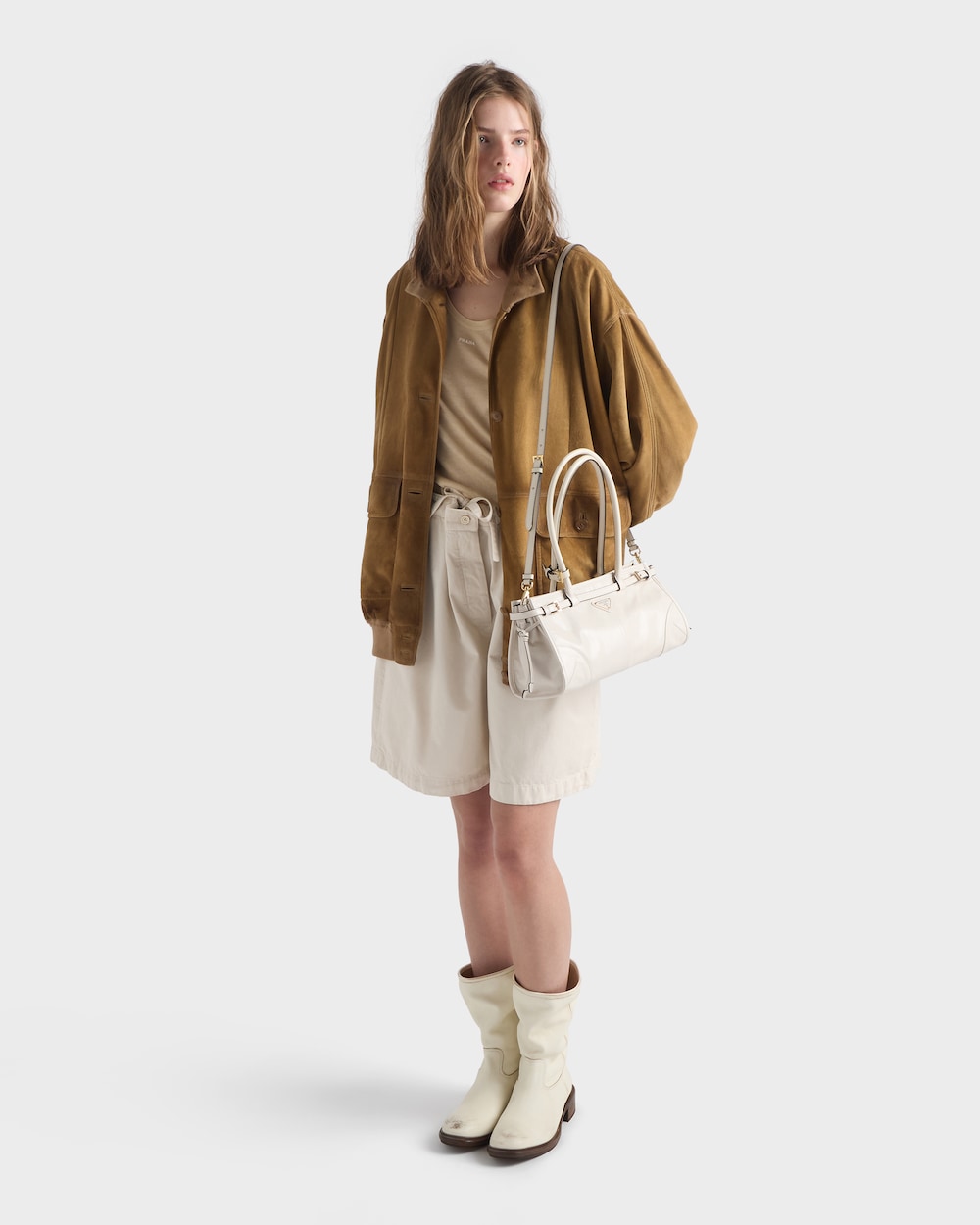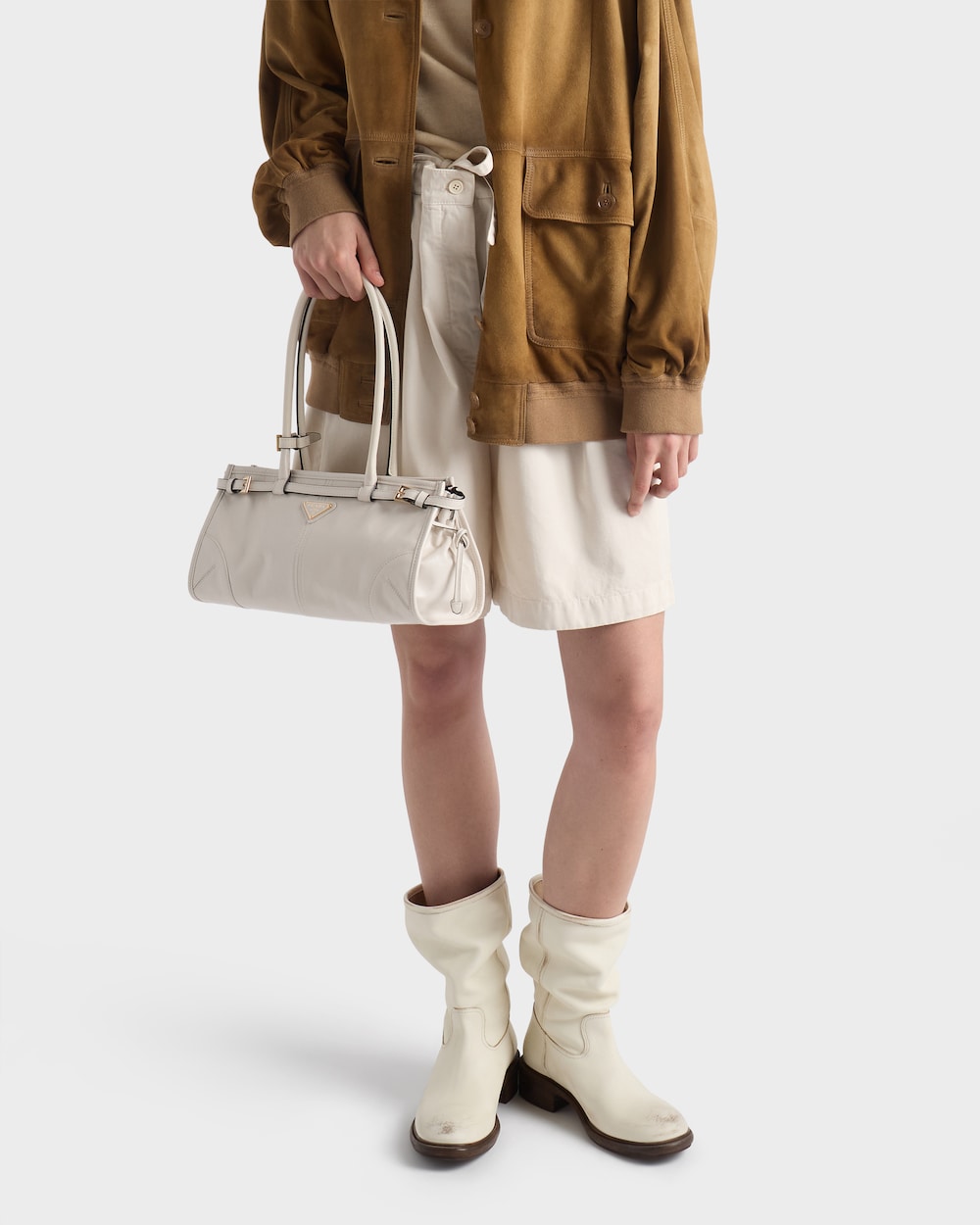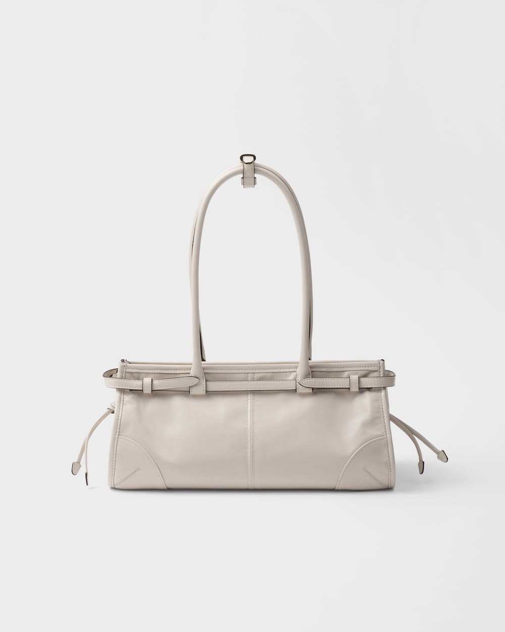 多用途でモダンな魅力を持つ艷やかな仕上がりのソフトレザーを使用した、実用的でエレガントなハンドバッグ。幾何学的なデザインに、多彩な要素が個性的でありながら洗練された美しさで1つのスタイルに融合されています。レクタンギュラーのシルエットに上品なストラップのディテールをあしらい、内側にファスナー付ポケットを配しています。エナメルメタルのトライアングルロゴがプラダらしいアイコニックな魅力を添えています。