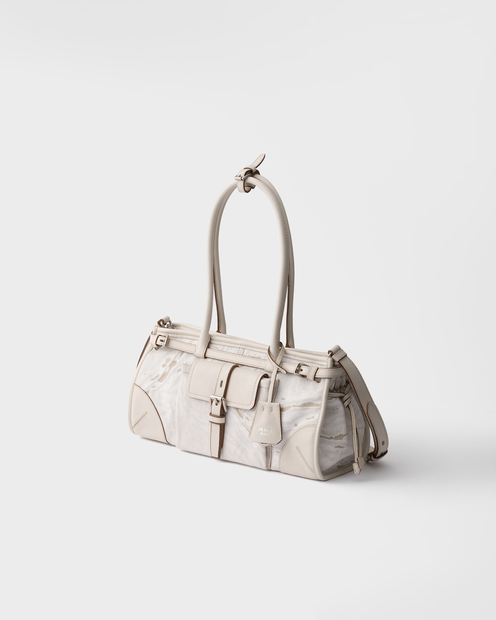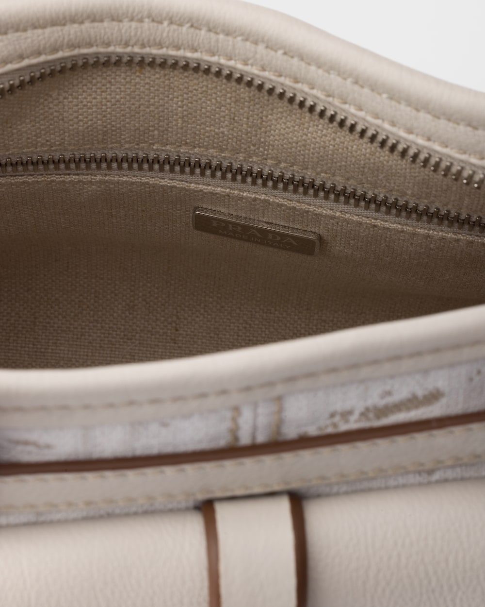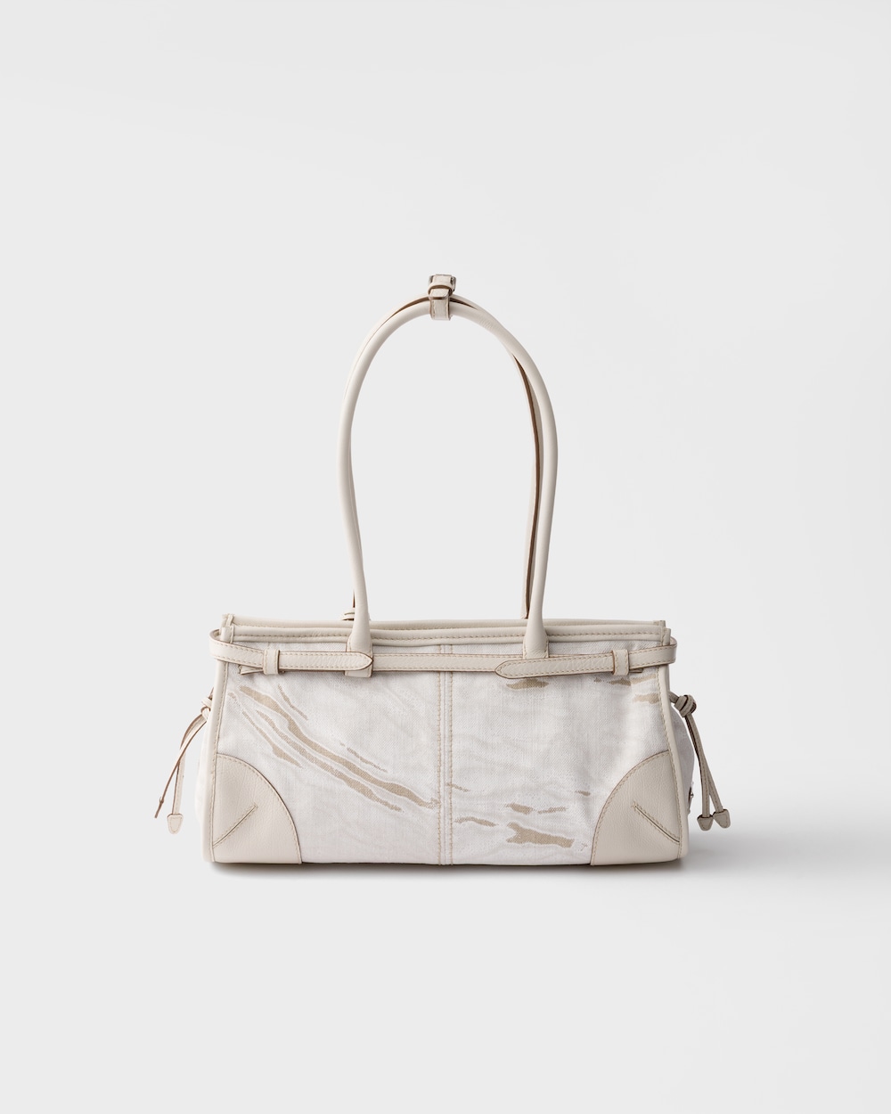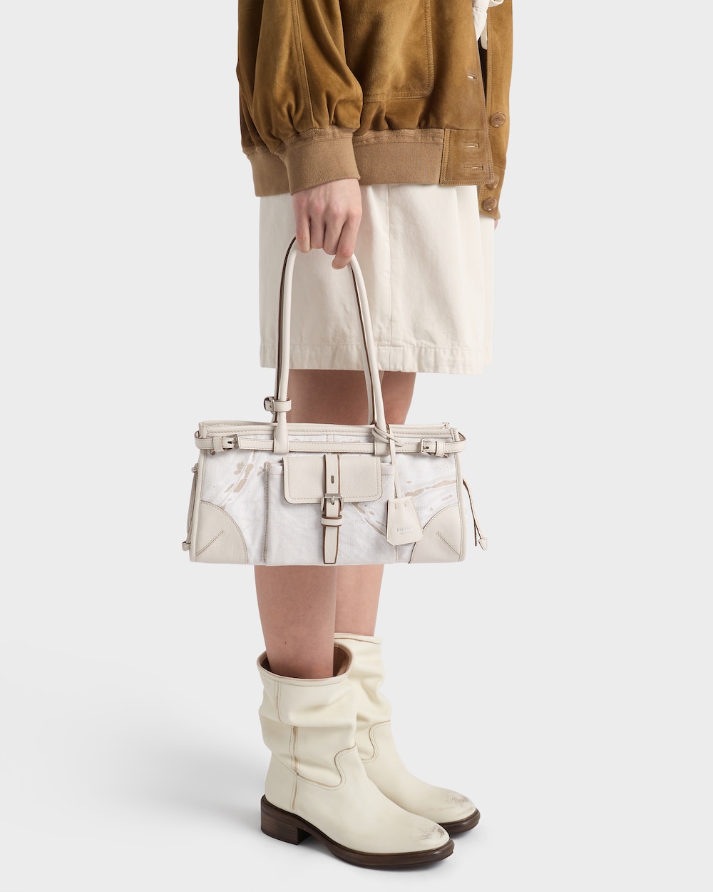 プラダ ボニー バッグのミディアムバージョンは、プリントリネンとレザーの洗練された組み合わせでアクセサリーの現代的なエレガンスを再解釈し、自然な質感と構造的なディテールがバランスよく調和しています。特徴的で洗練された幾何学的なシルエットは、アーキテクチュアルな厳格さと日常の機能性を兼ね備えています。アーカイブの要素は、フロントフラップポケットのストラップとバックル、メタルパーツ、サイドレースに見られ、ブランドの歴史的な言語へのアイコニックな参照です。レザーのハンドルとディテールがデザインの洗練されたキャラクターを際立たせます。取り外し・調節可能なショルダーストラップにより、さまざまなシーンに簡単に対応できる多用途性を持たせています。