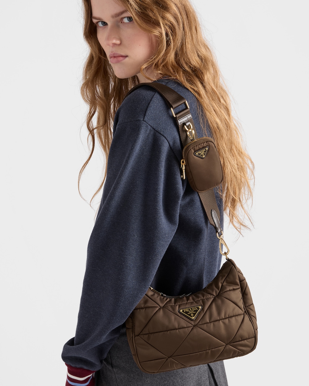 トライアングルモチーフが特徴の、パッド入りホーボーバッグ。ソフトなデザインのRe-Nylonで作られています。アイコニック エナメルメタル トライアングルロゴがあしらわれ、取り外し可能なナイロンのファスナー付ポーチが付属しており、機能性と現代的な個性を加えています。サスティナブルなお手入れ方法:製品の風合いを保つため、また環境への負荷を軽減するために、製品を頻繁にクリーニングすることを推奨しておりません。使用後は風通しの良い場所で陰干ししていただき、クリーニングが必要な場合は環境に配慮したクリーニング店でドライクリーニングをすることをおすすめします。