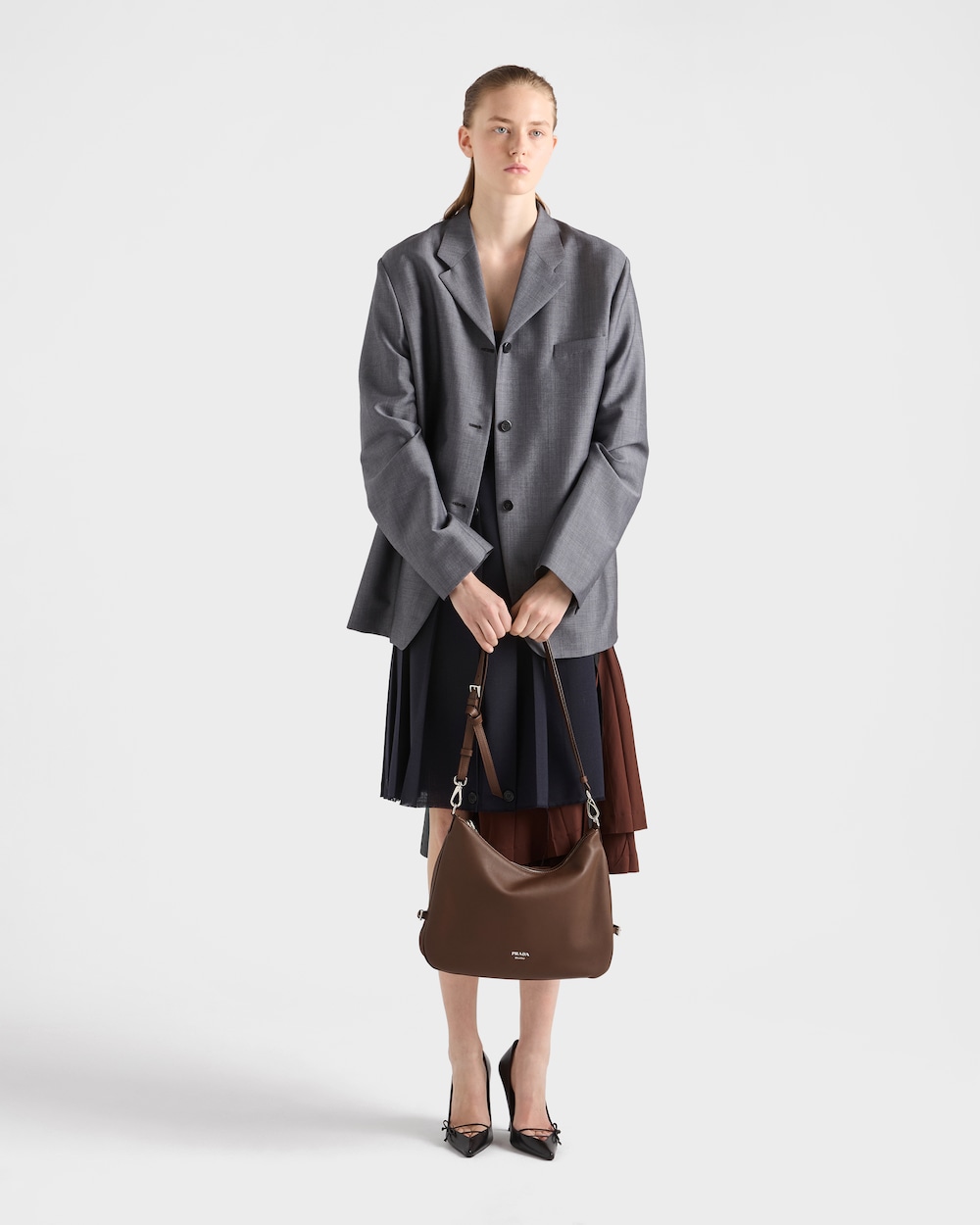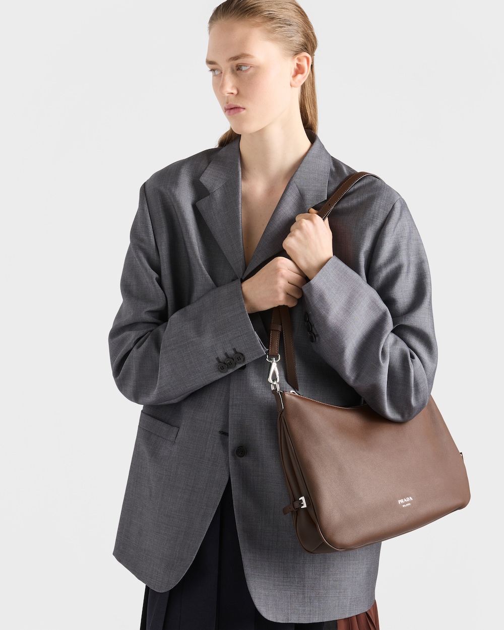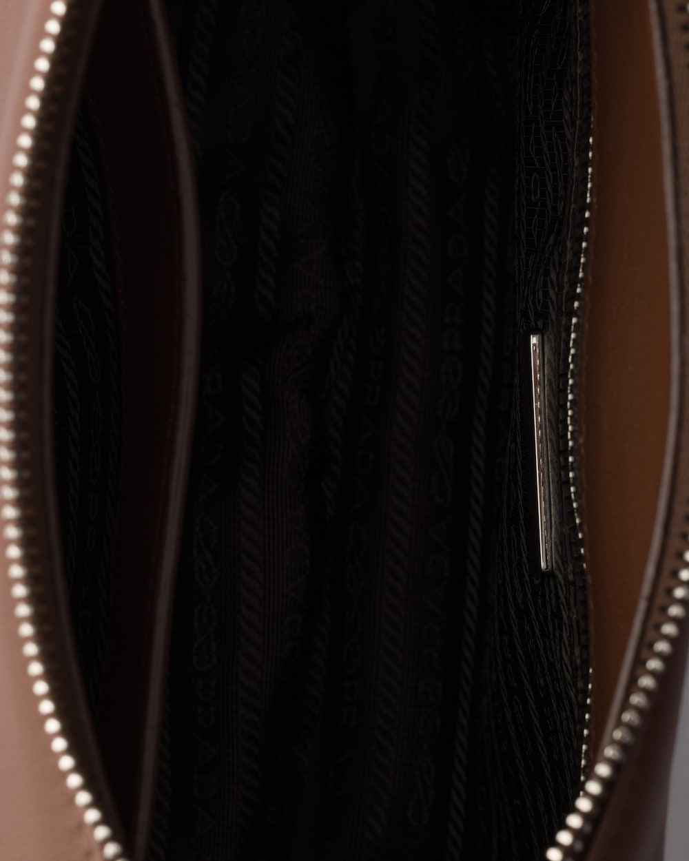純粋で洗練されたフォルムがプラダの驚くほどモダンな精神を体現しています。このレザーバッグは、洗練されたデザインに職人技を際立たせる機能的な要素が加えられています。