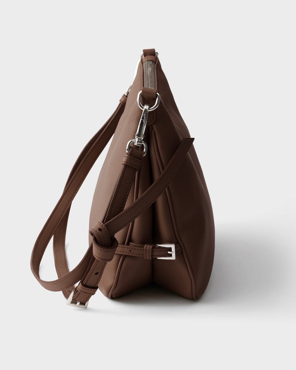 現代的でミニマルなエレガンスが特徴のこのバッグは、洗練されたディテールとプラダのアーカイブの要素で定義されています。レザーバッグは柔らかな収納部分2個を備え、ファスナー開閉式が実用的で多用途な特徴を際立たせます。調節可能なレザーショルダーストラップが付いており、ショルダーバッグやクロスボディバッグとして日常使いに便利なデザインです。