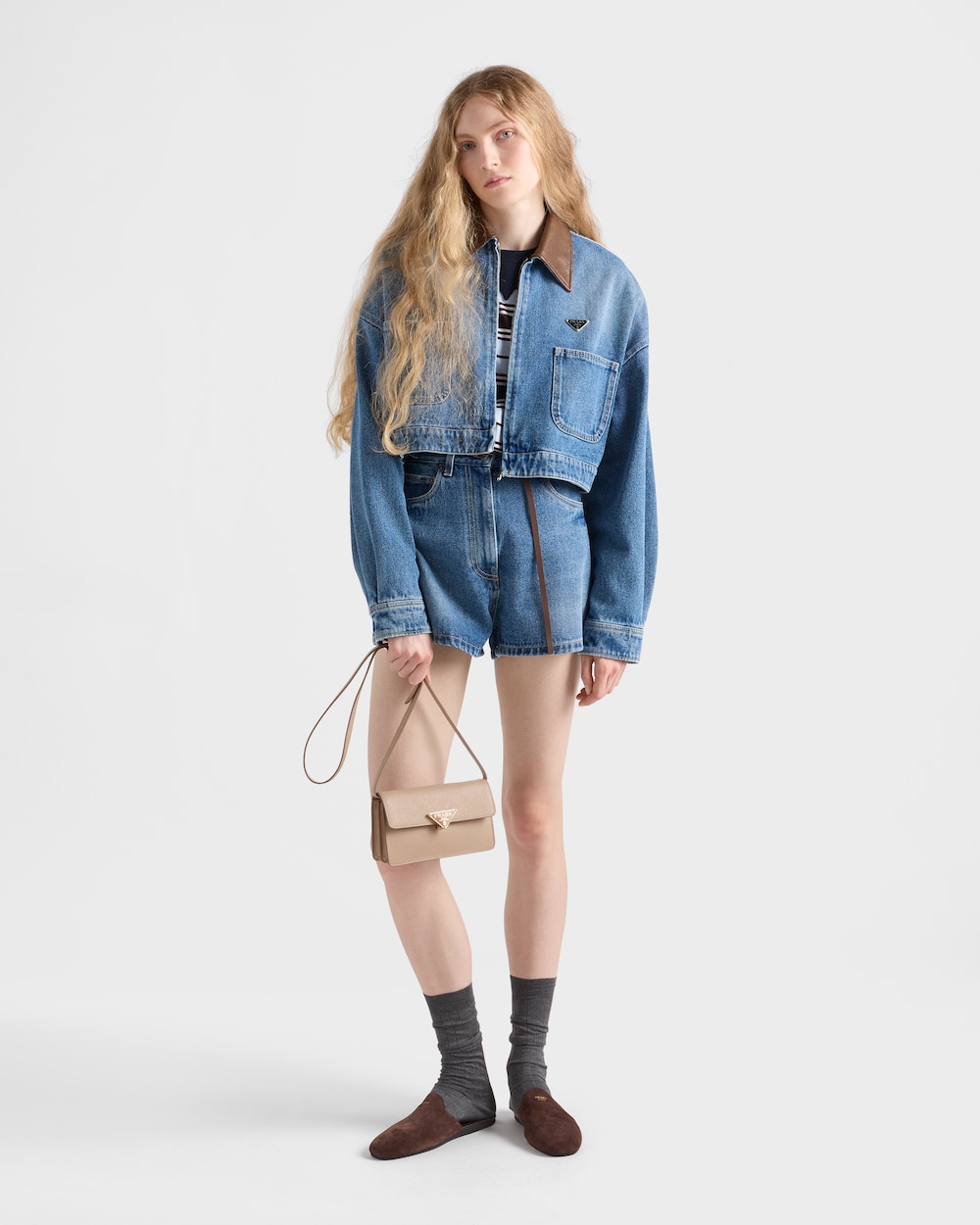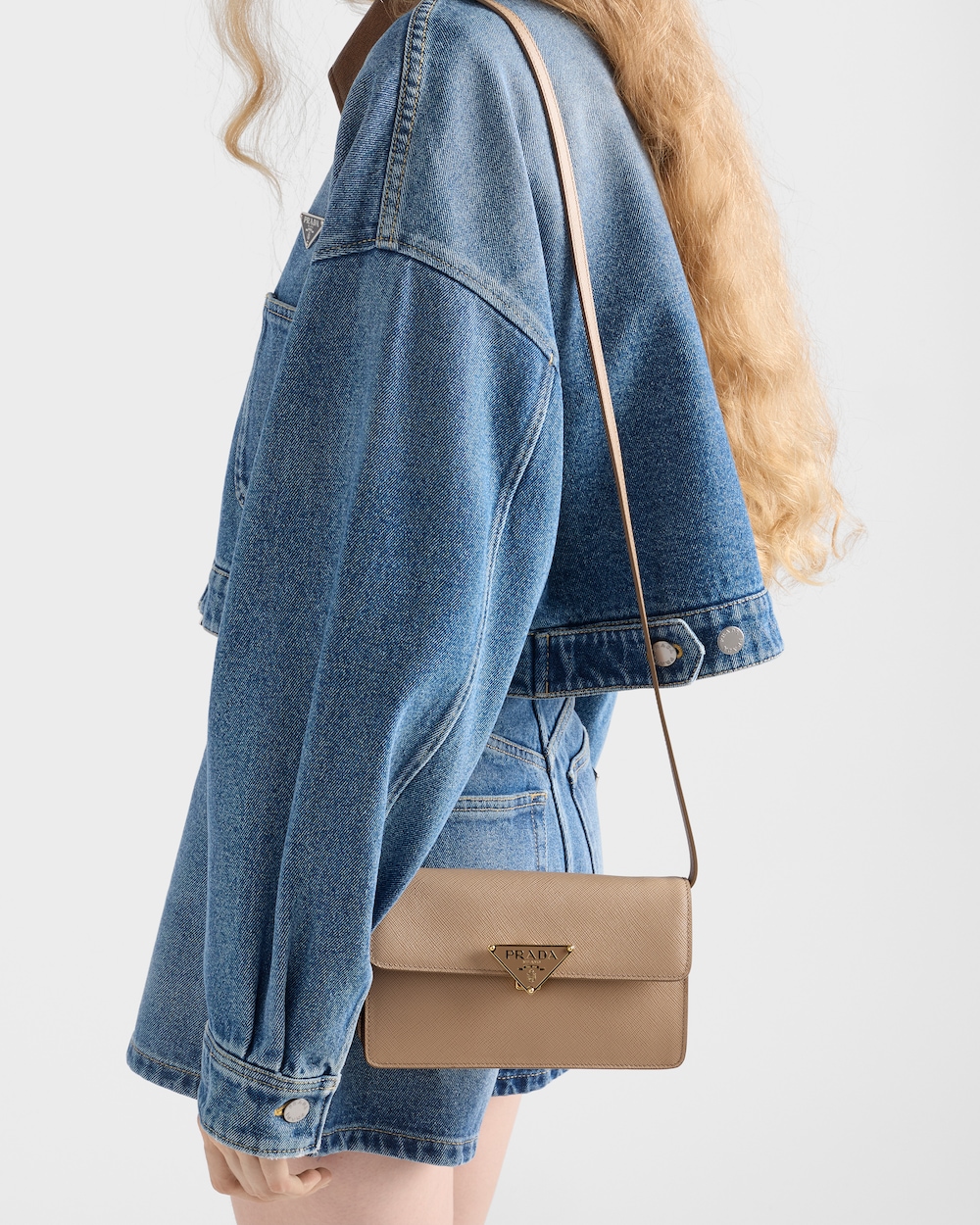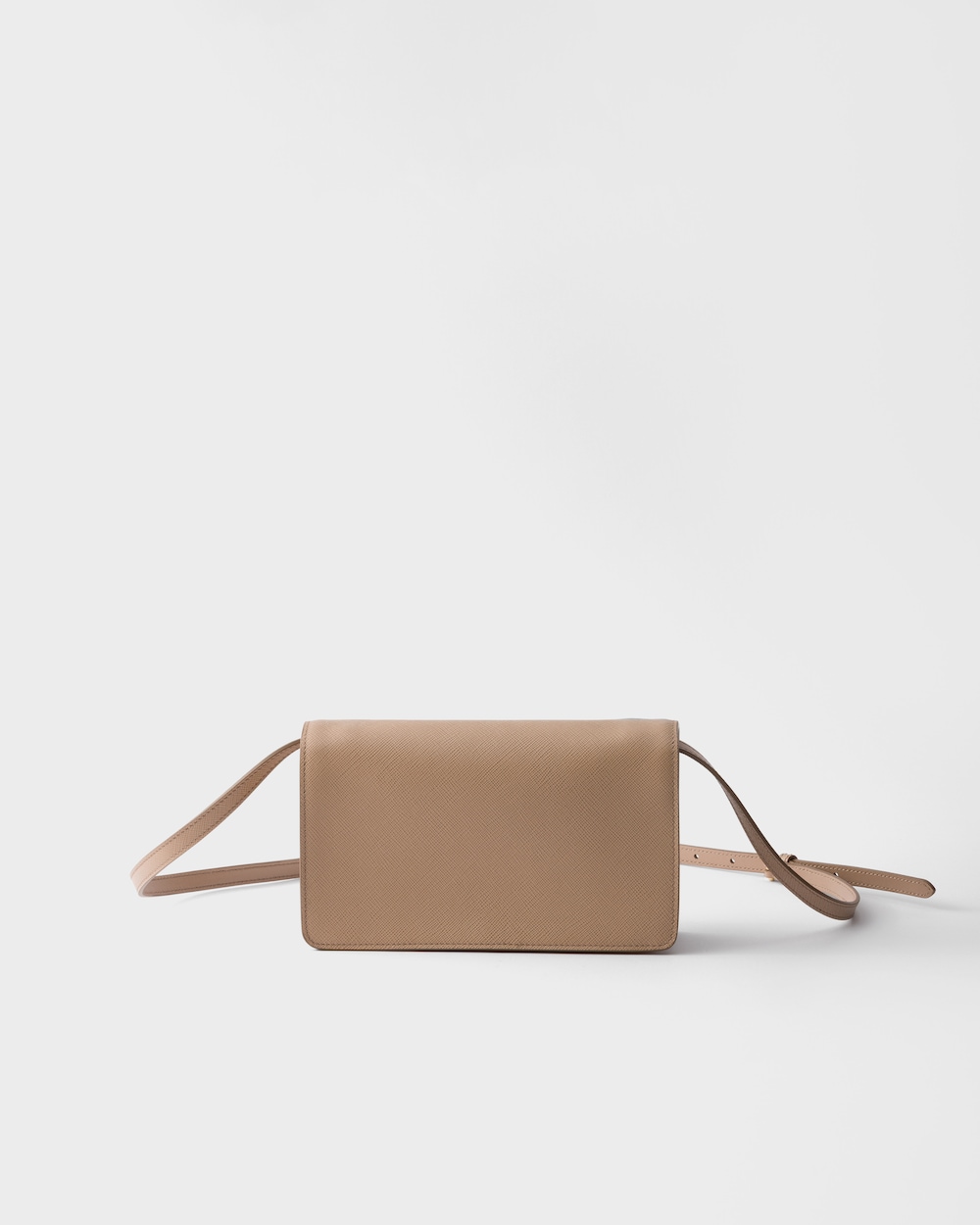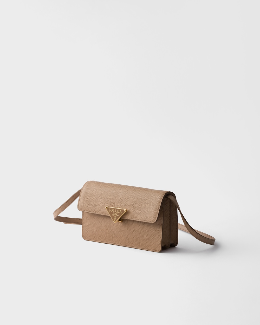 洗練されたコンパクトなミニバッグ。プラダを象徴する素材であるクロスハッチ加工とワックス仕上げが特徴の「サフィアーノ」レザー(牛革)を使用。内部ポケットやカードスロットを備えた構造的なシルエットに、留め具を飾るアイコニックなトライアングルのような金属製ハードウェアが付いています。