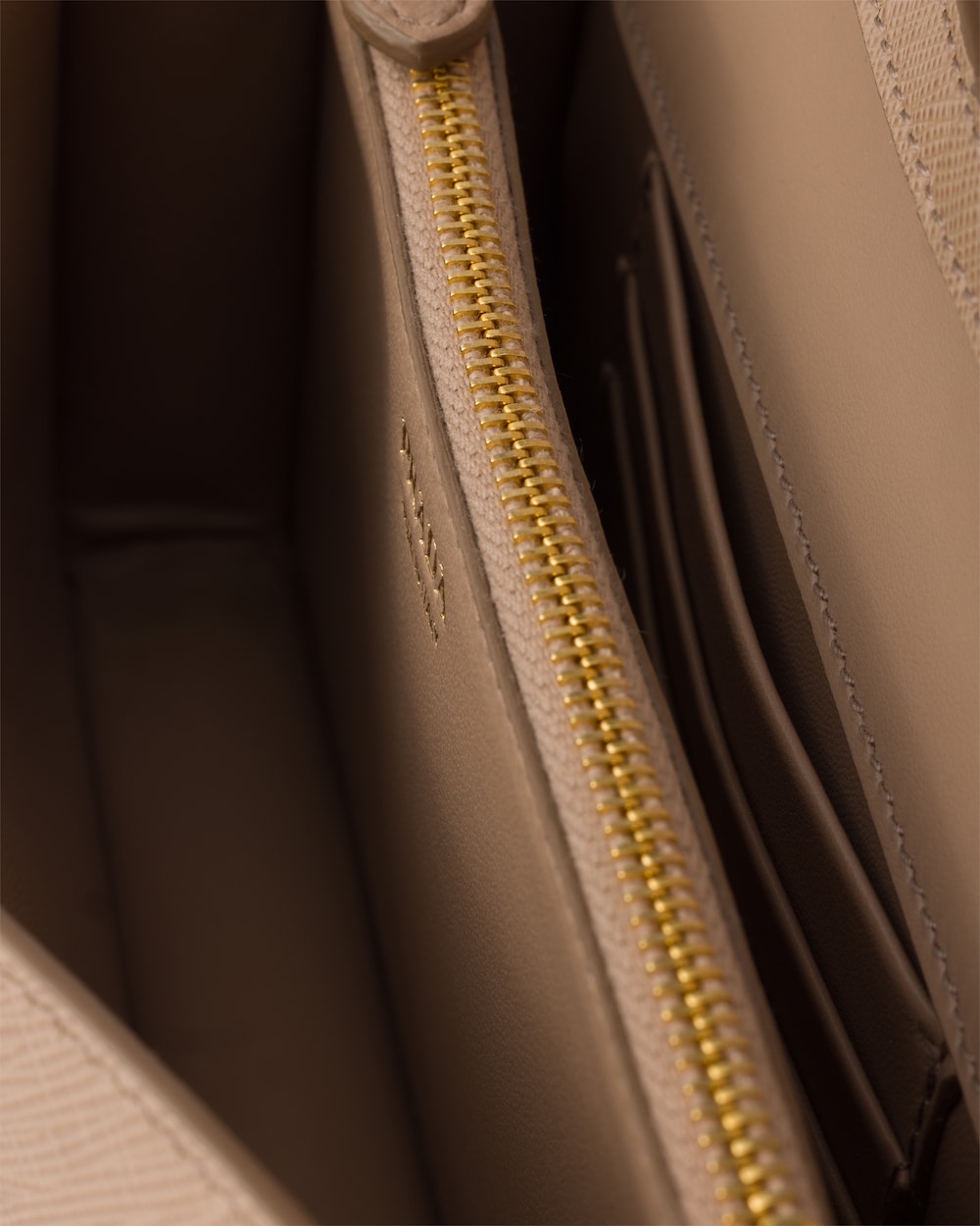 - カードスロットと中央ファスナーポケットを備えたナッパレザー(羊革)ライニング