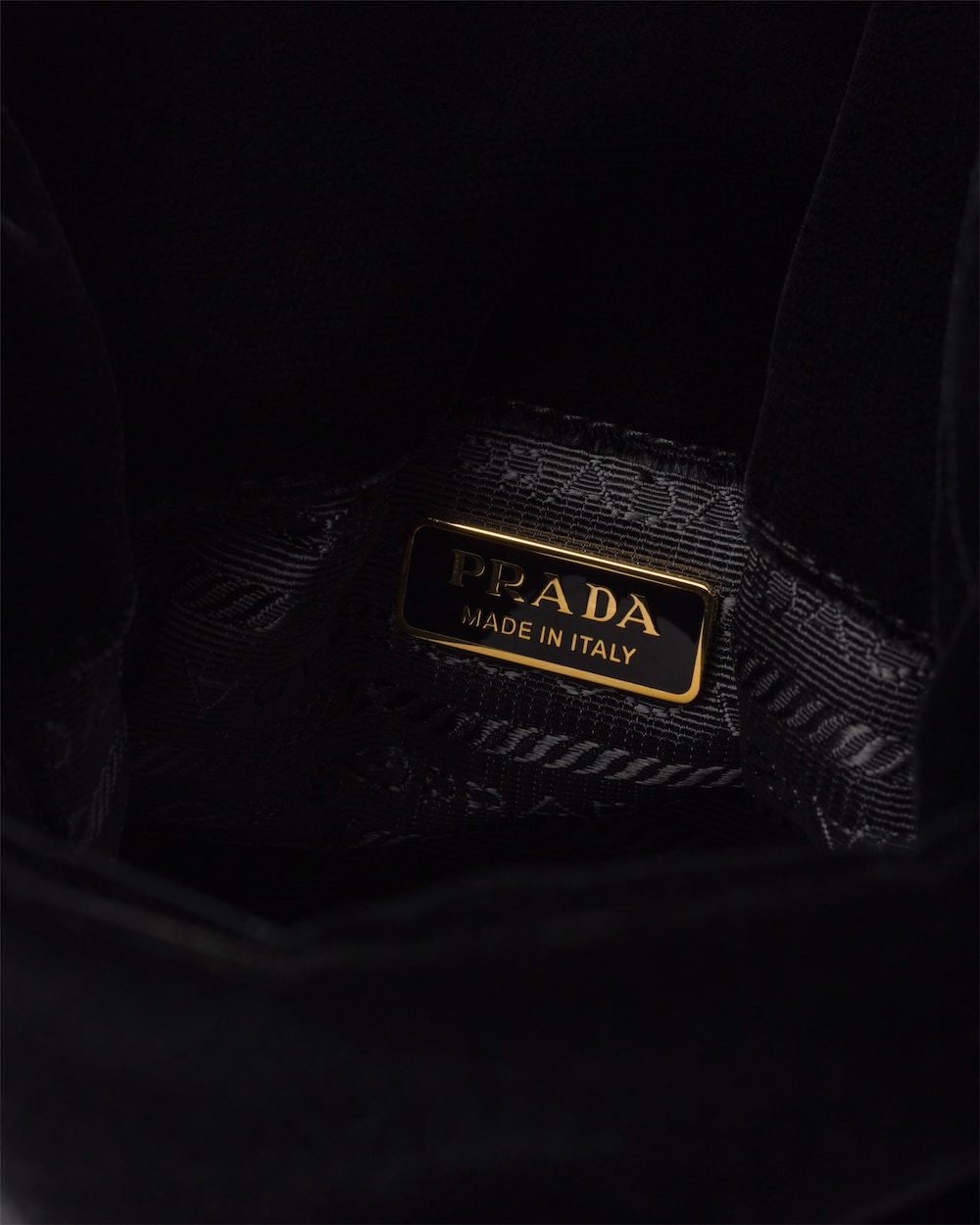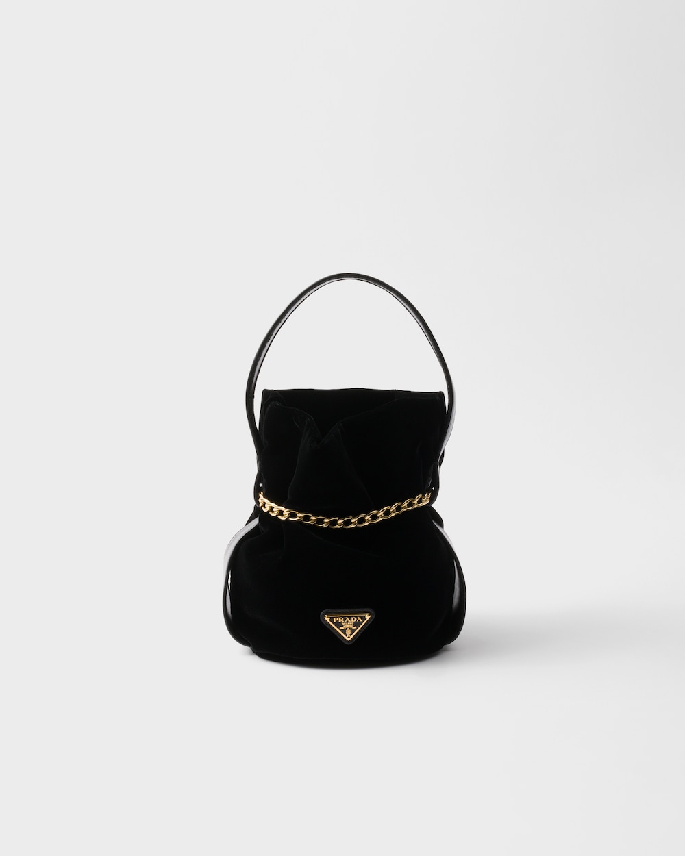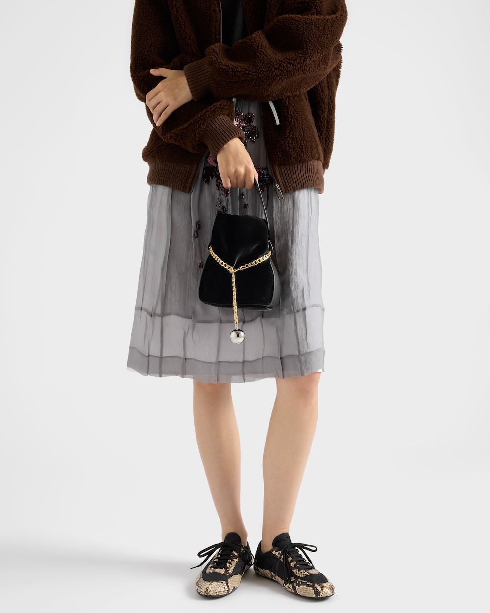 洗練された現代的なアイデンティティが際立つバケットバッグ。ソフトなシルエットに、ベルベットとナッパレザー(羊革)を使用し、上品な質感を演出しています。シンプルで洗練されたデザインに、球形ペンダント付きチェーンのようなマクロディテールが組み合わさることで、独自の個性とエレガンスが際立ちます。