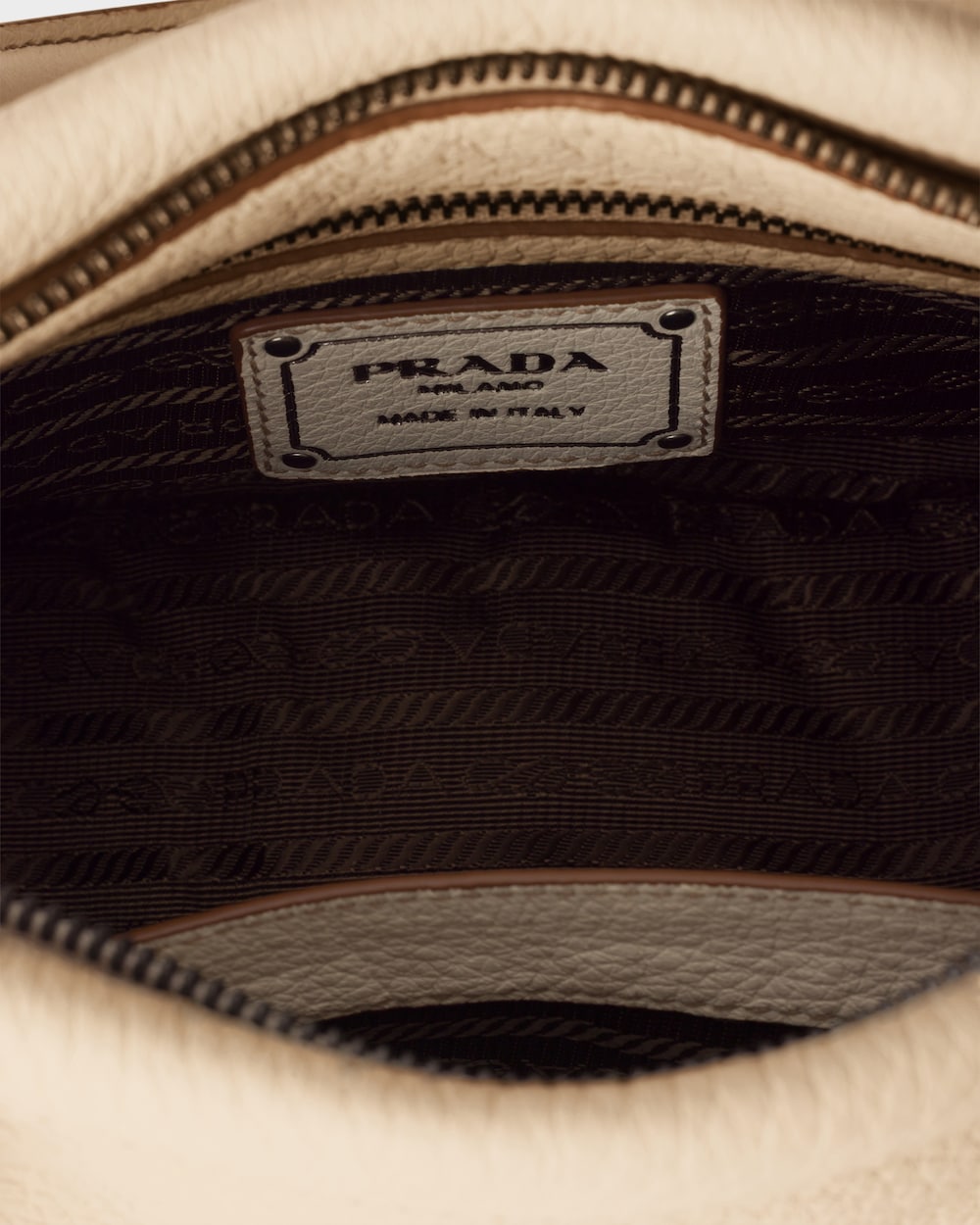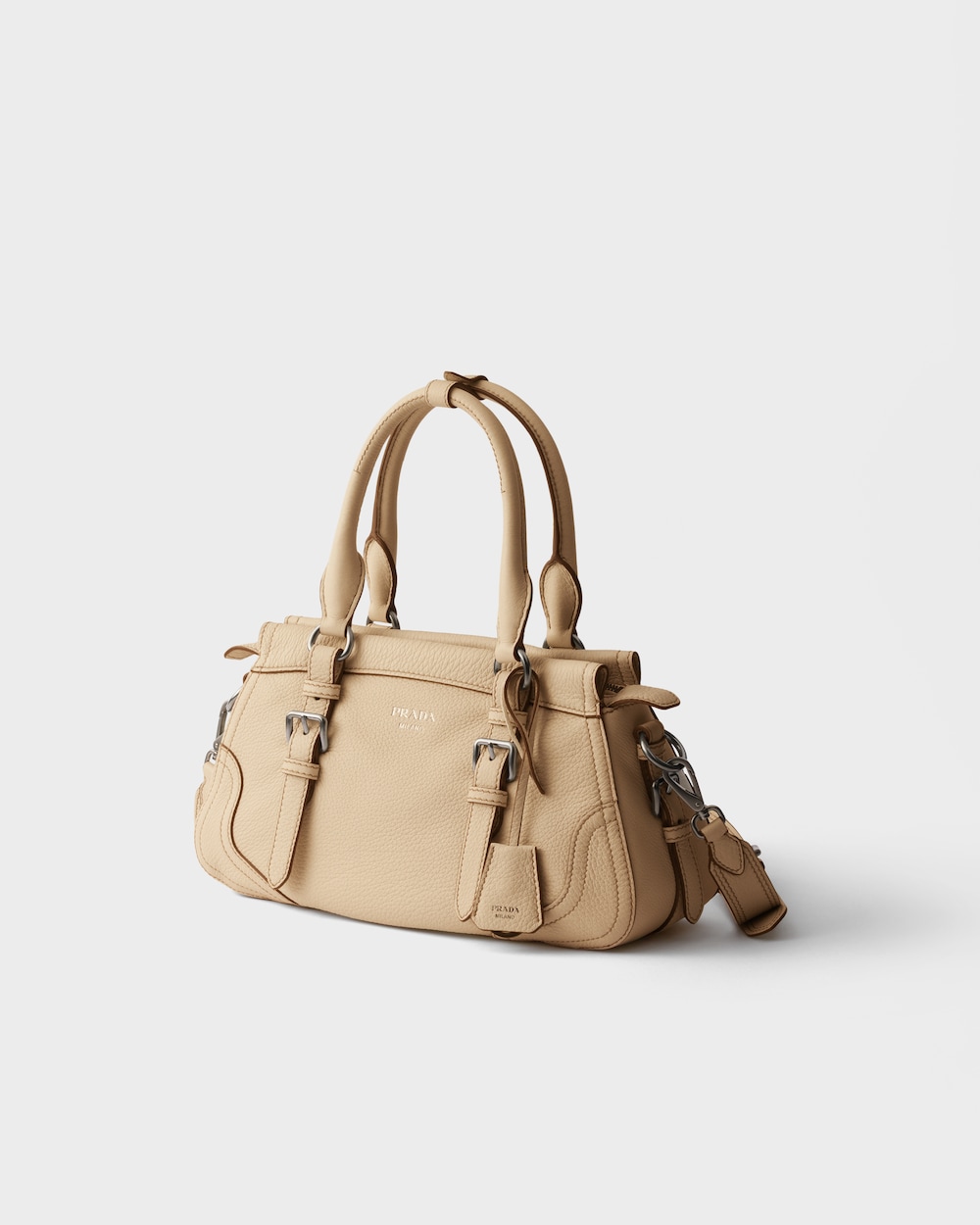 過去と現在の調和の中で、このバッグはプラダのDNAのルーツに立ち返り、旅をテーマにしたデザインを想起させます。豊かな質感と不規則なシボのあるレザーで作られたコンパクトで多用途なシルエットは、アクセサリーをさまざまなスタイルで身につけられるよう、取り外し可能なショルダーストラップで仕上げられています。旅行バッグに着想を得た補強されたコーナーは、伝統的な職人技とアーカイブとの絶え間ない対話を表現しています。