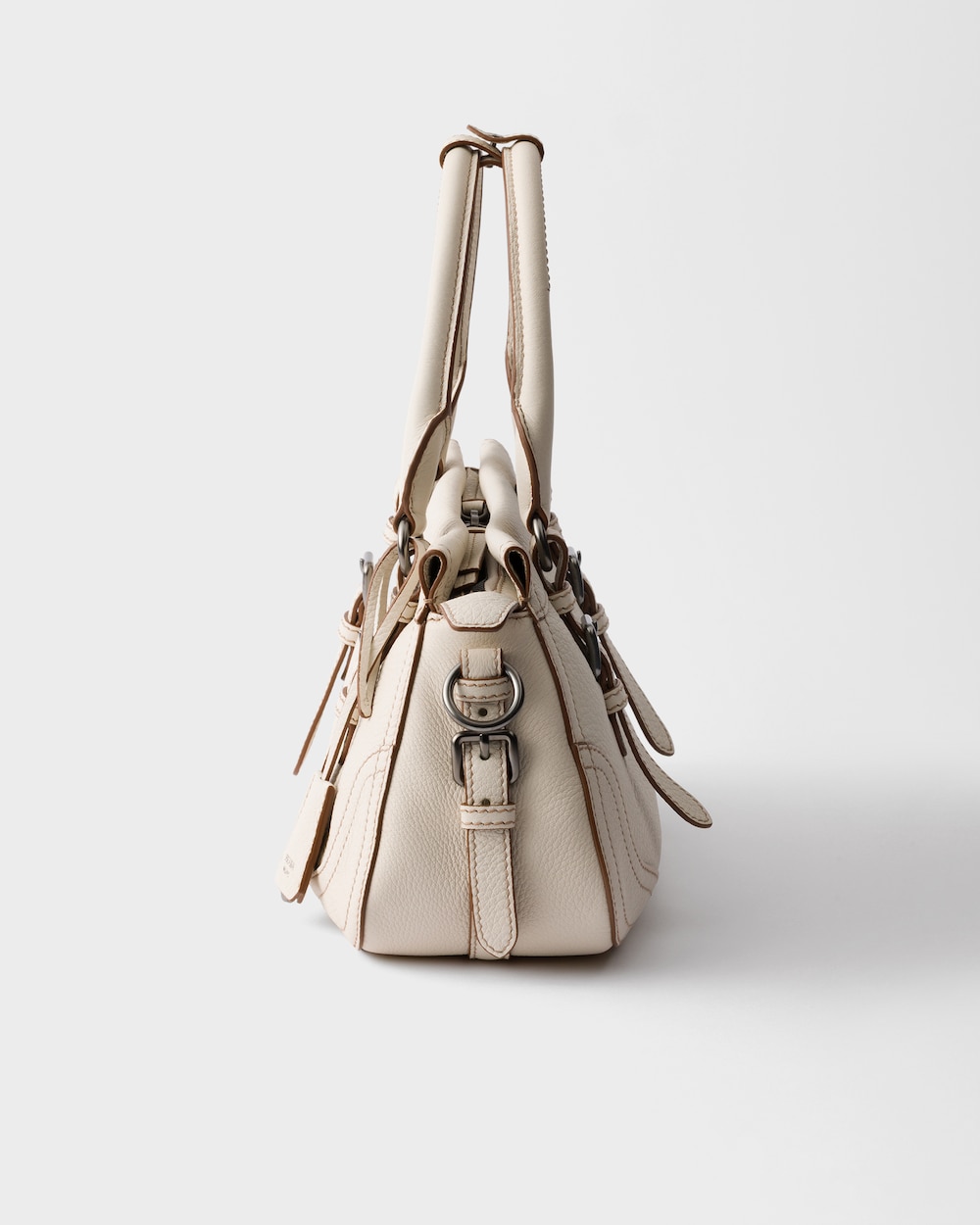 過去と現在の調和の中で、このバッグはプラダのDNAのルーツに立ち返り、旅をテーマにしたデザインを想起させます。豊かな質感と不規則なシボのあるレザーで作られたコンパクトで多用途なシルエットは、アクセサリーをさまざまなスタイルで身につけられるよう、取り外し可能なショルダーストラップで仕上げられています。旅行バッグに着想を得た補強されたコーナーは、伝統的な職人技とアーカイブとの絶え間ない対話を表現しています。