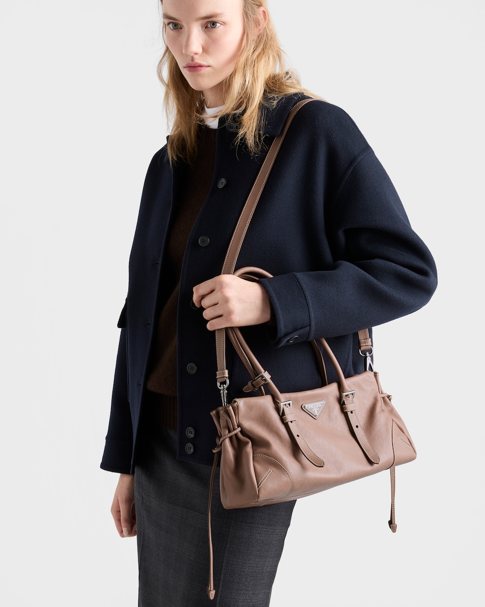 アンティーク仕上げのレザー バッグは、洗練された現代的な個性を体現しています。幾何学的なシルエットは、アーカイブのディテールとともに、モダンさとエレガンスを融合させており、伝統と革新の絶え間ない対話を表現しています。メタルバックルとサイドレースは、過去のプラダのアイコニックなスタイルを彷彿とさせる一方で、長めのハンドルは実用的でカジュアルな姿勢を示しています。