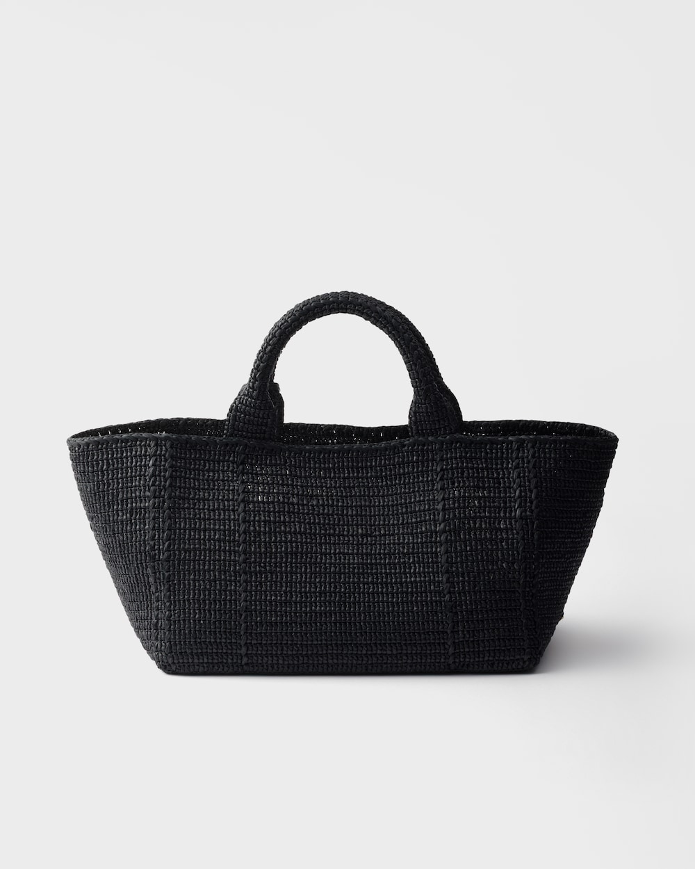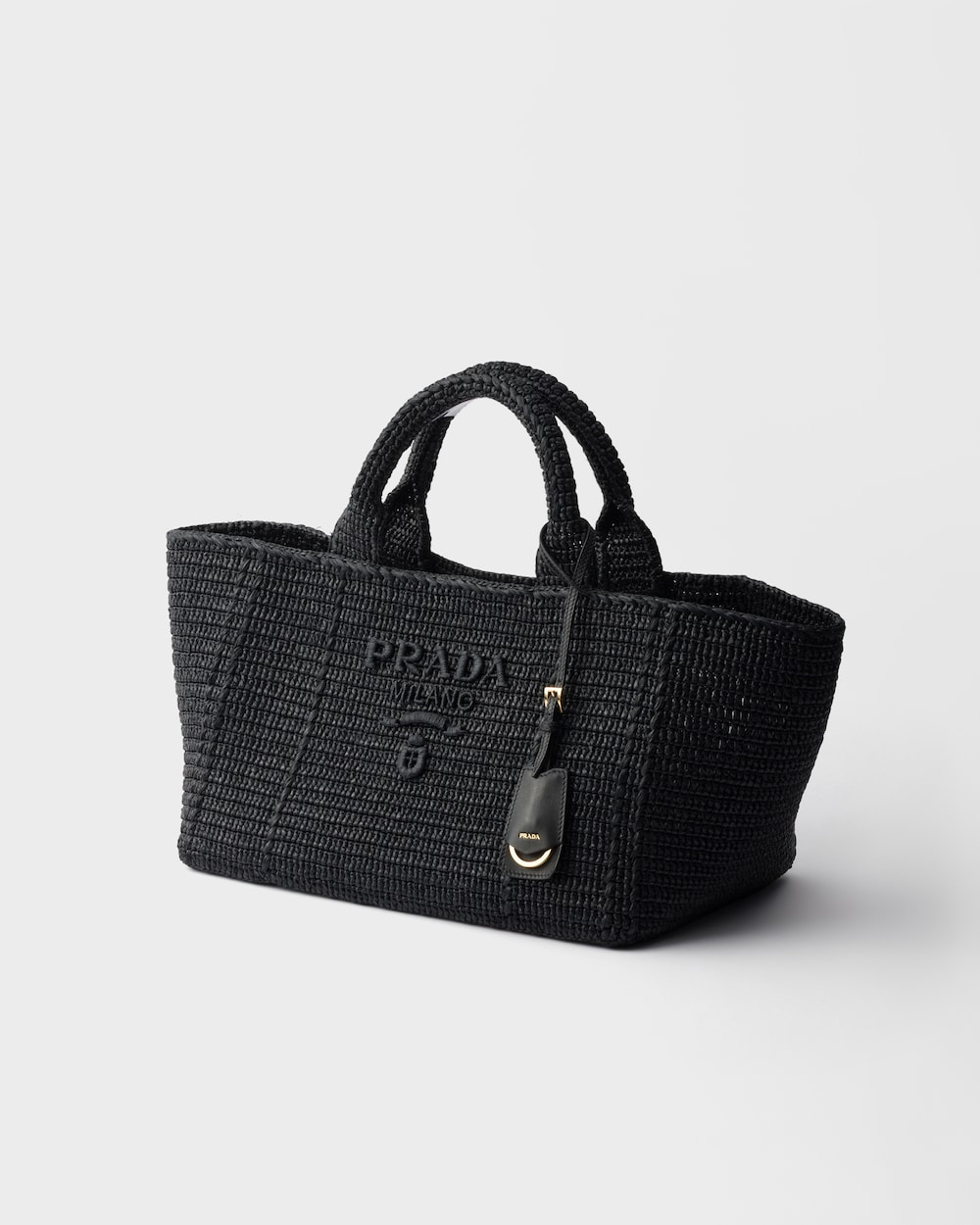 柔らかなデコンストラクテッドデザインのトートバッグ。軽やかで夏らしい雰囲気を漂わせるラフィア風の加工を施したファブリックを使用しています。前面に刺繍されたプラダのアイコニックなマクロレタリングロゴがシルエットを豊かにします。