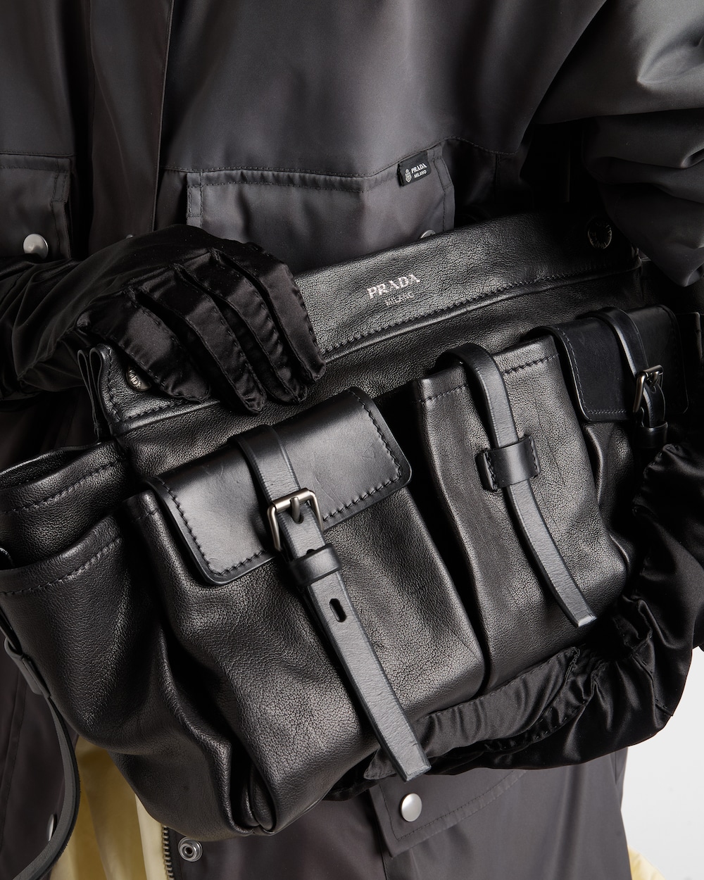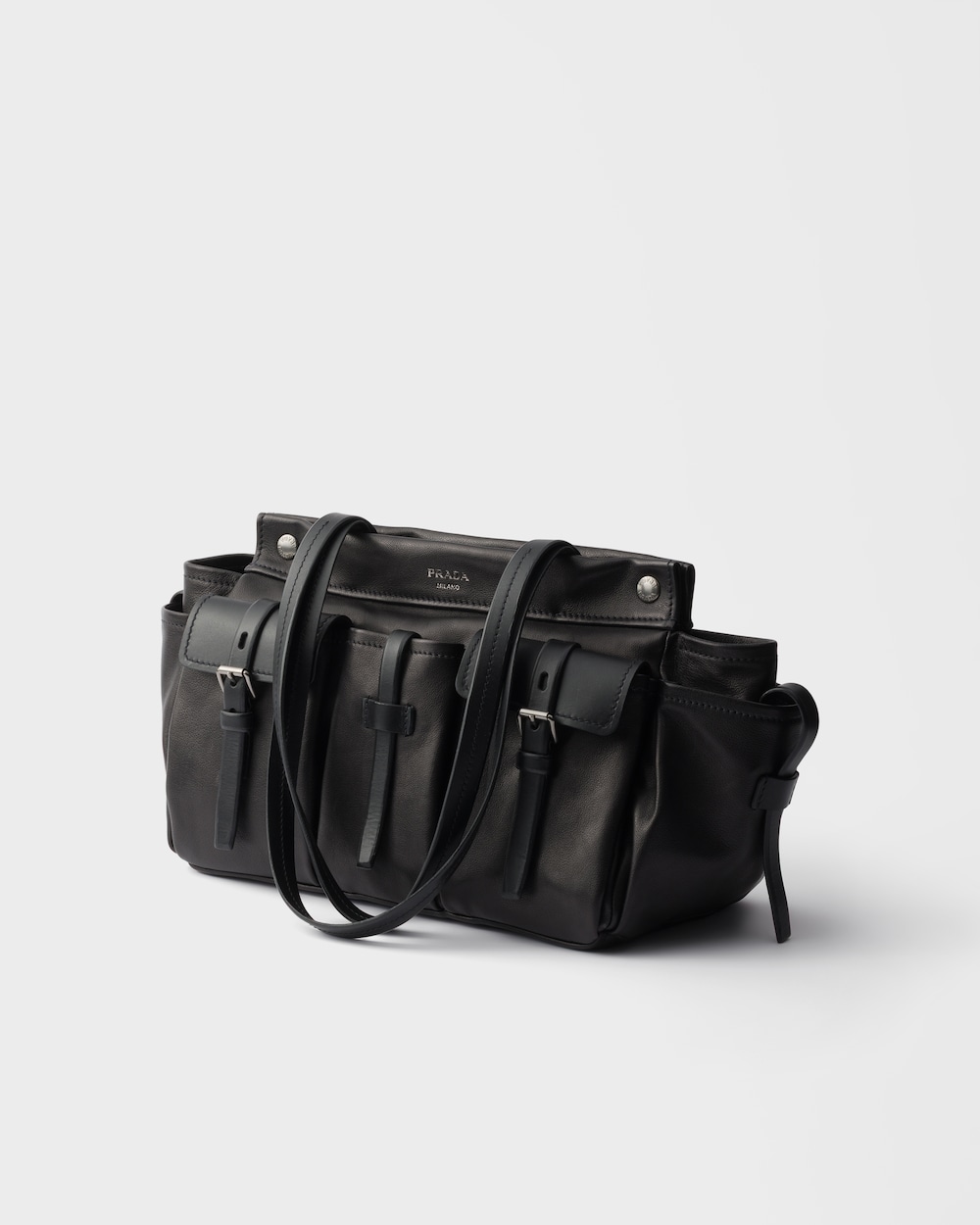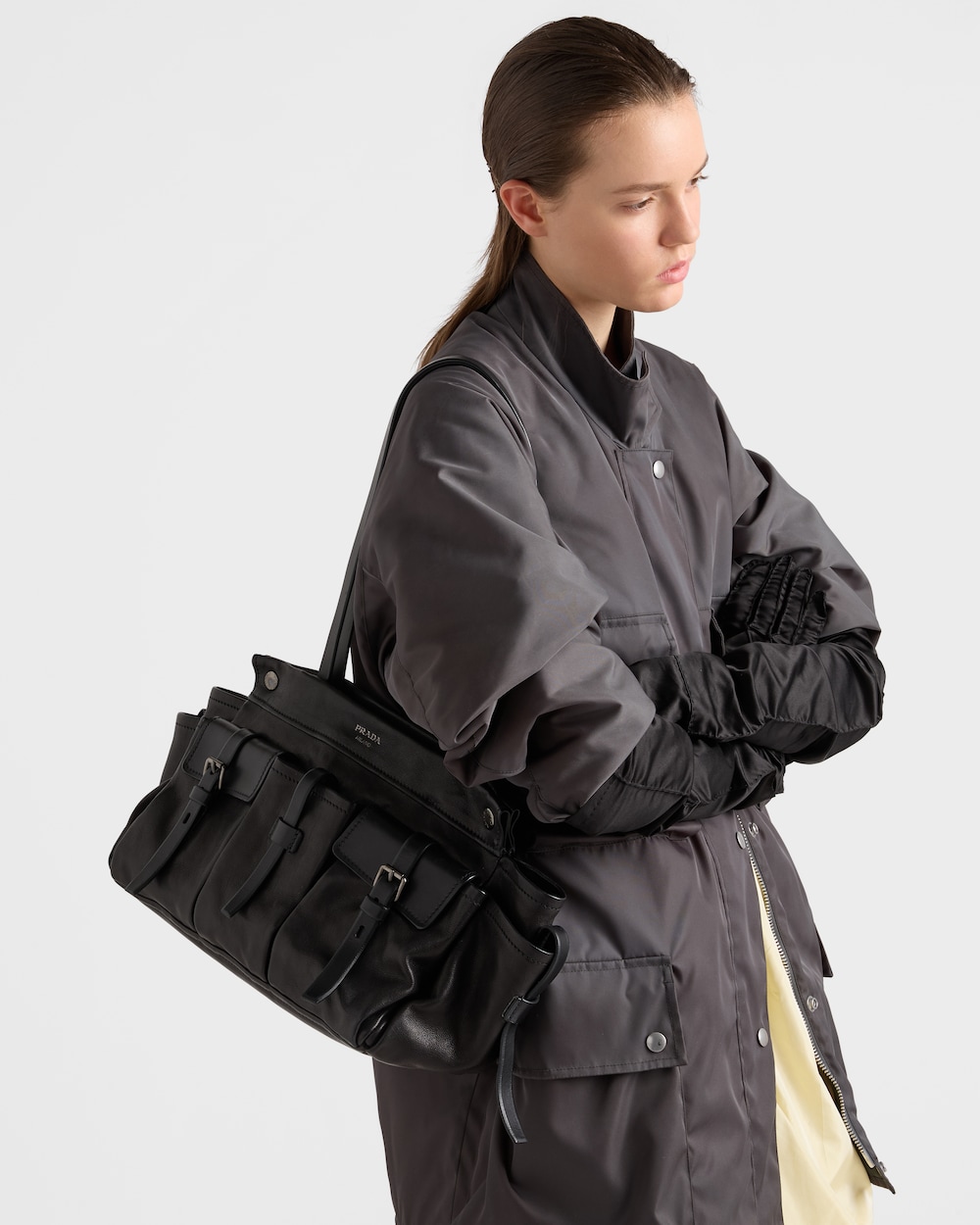 ポケットは、機能的かつ装飾的な要素として、このトートバッグのデザインにおける主役となっています。多用途で現代的なスタイルは、広々としたボリュームと洗練された美学を組み合わせ、特徴的なアーカイブディテールを想起させるレザーストラップで装飾されています。