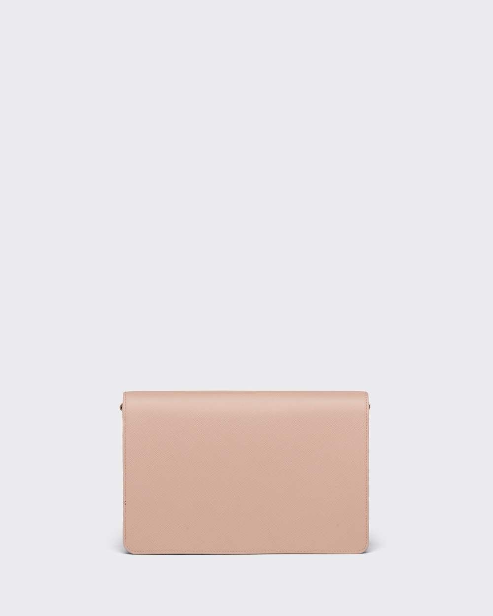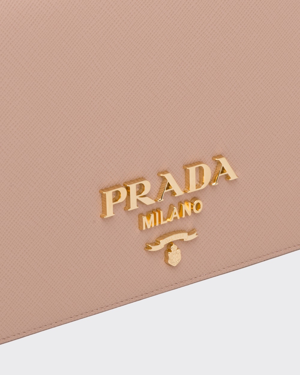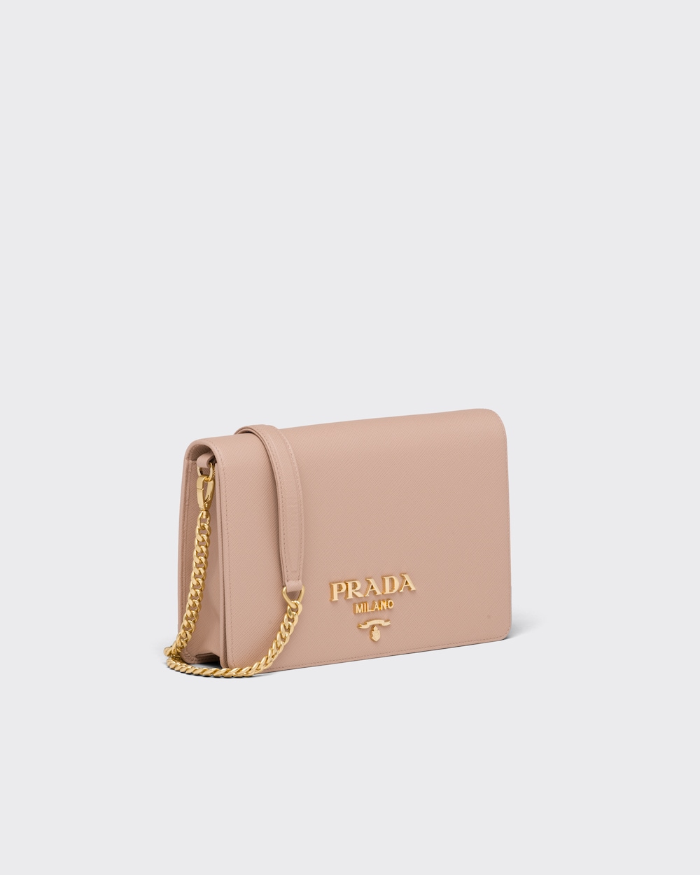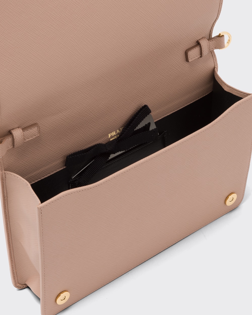 洗練されたミニマルなデザインの「サフィアーノ」レザー(牛革)のミニバッグ。ショルダーストラップ付。メタルロゴがあしらわれています。