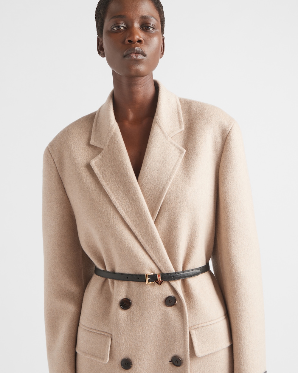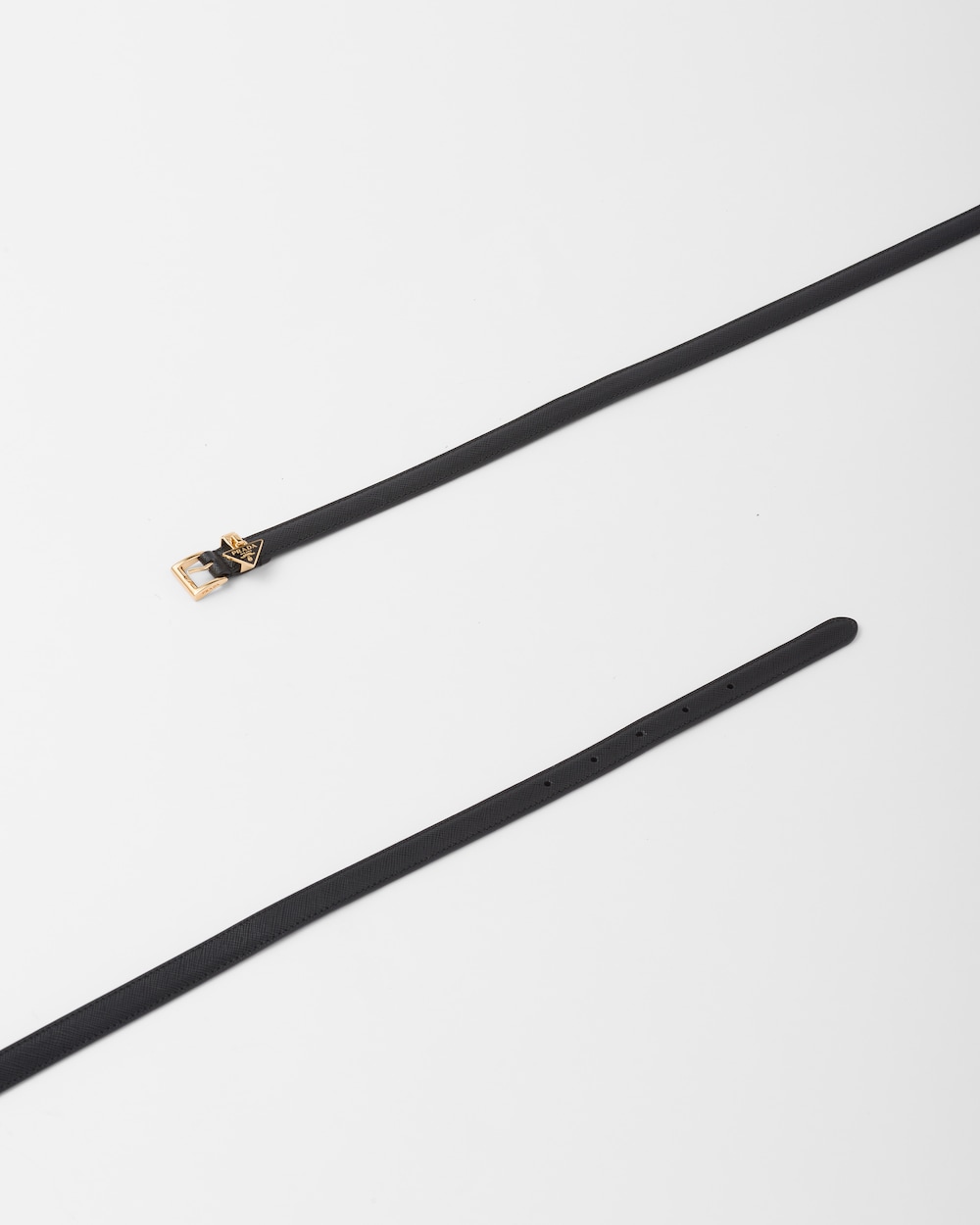 女性らしいデザインが際立つ、上品な「サフィアーノ」レザー(牛革)のベルト。メタルのトライアングルロゴチャームがあしらわれています。