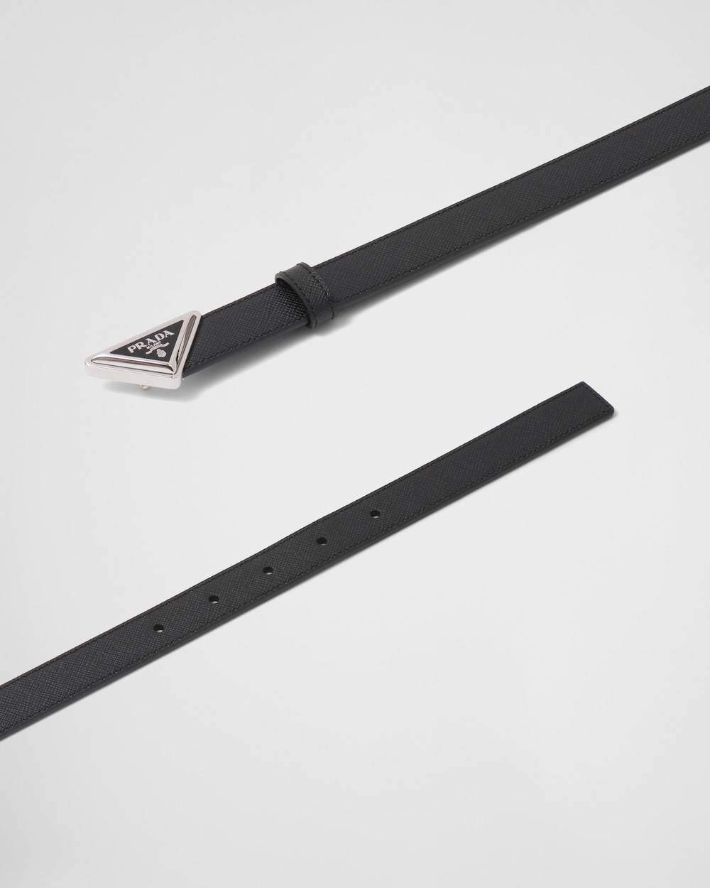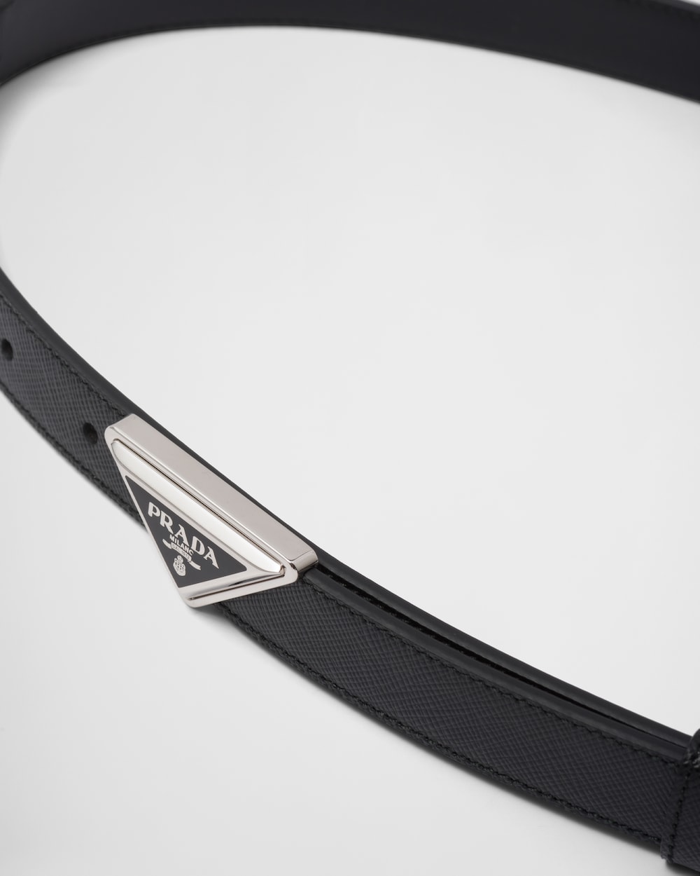 アイコニックなトライアングルロゴを彷彿とさせるメタルバックルを備えた、上品で洗練されたデザインが特徴のベルト。ワックス仕上げとクロスハッチ加工の質感が際立つ、プラダを象徴する「サフィアーノ」レザー(牛革)を使用しています。