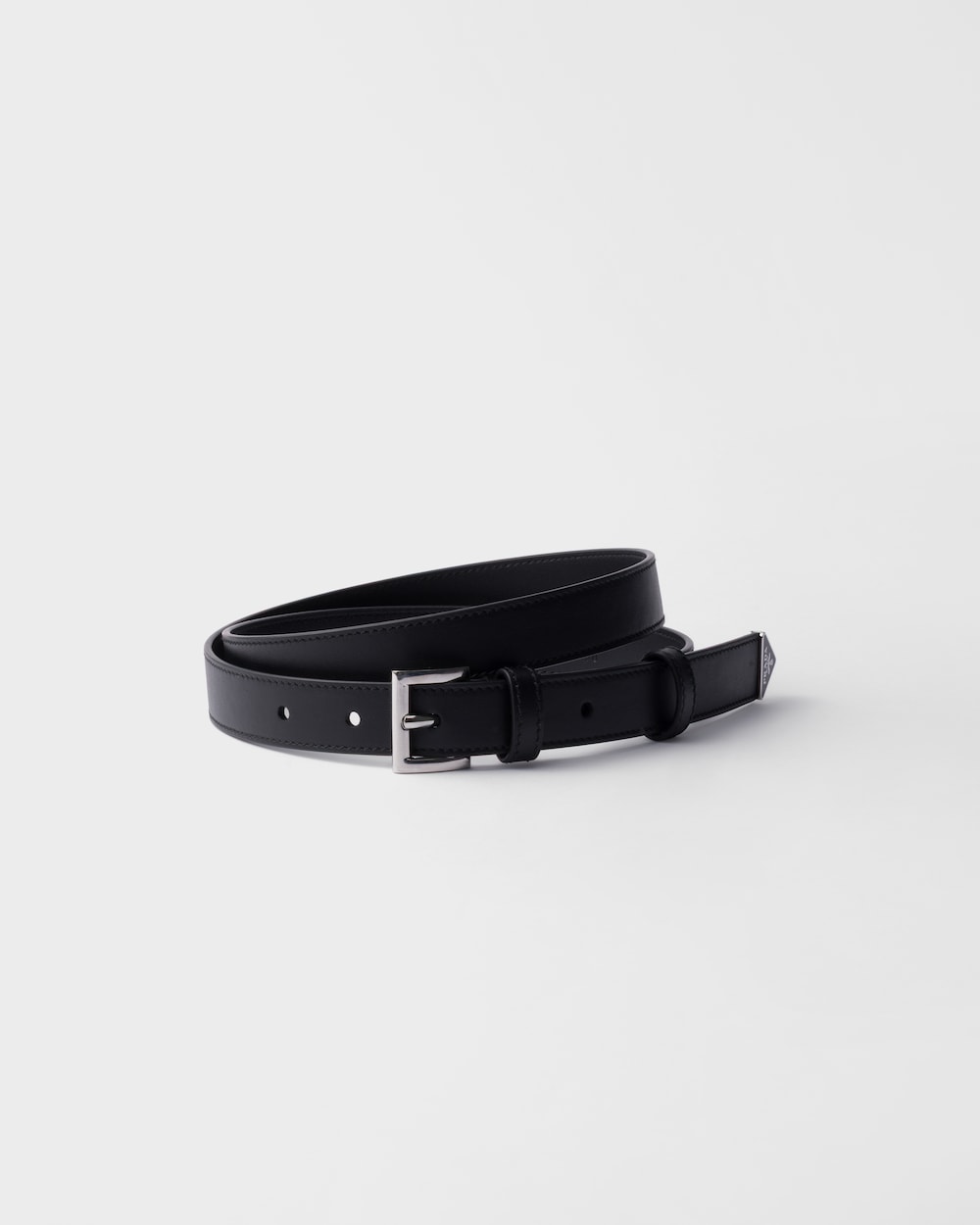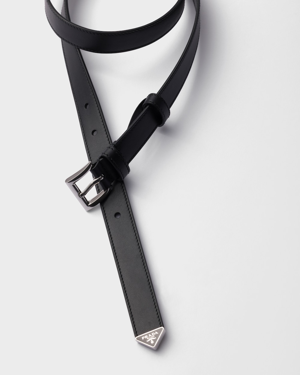 洗練されたラインを描く、上品なデザインが特徴のレザーベルト。アイコニックなエナメルメタルのトライアングルロゴがあしらわれています。