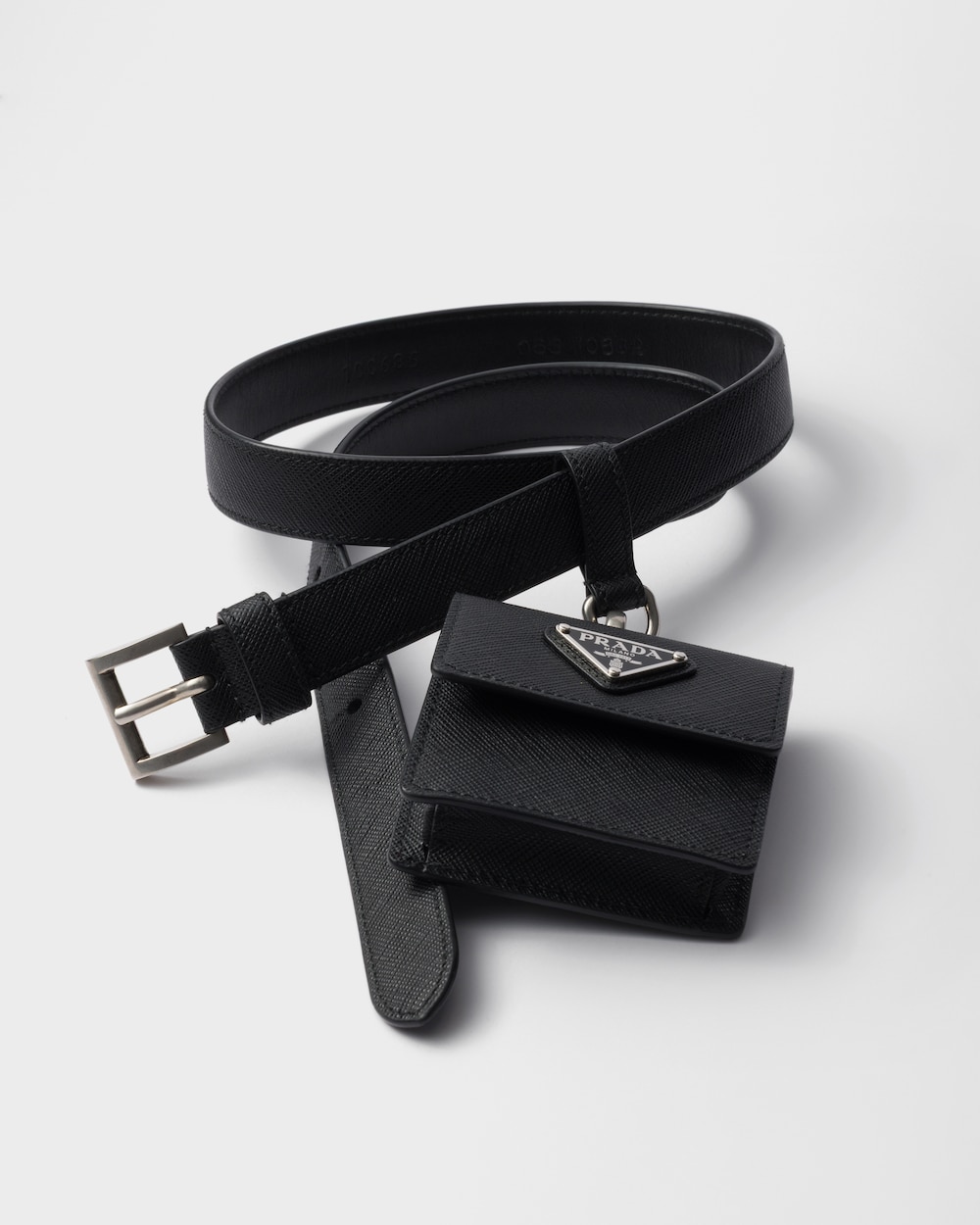 「サフィアーノ」レザー(牛革)のエレガントな多機能ベルト。取り外し可能なミニポーチが洗練されたデザインを引き立てます。エナメルメタルのトライアングルロゴが現代的なエレガンスにプラダらしいアクセントを添えるアイテム。