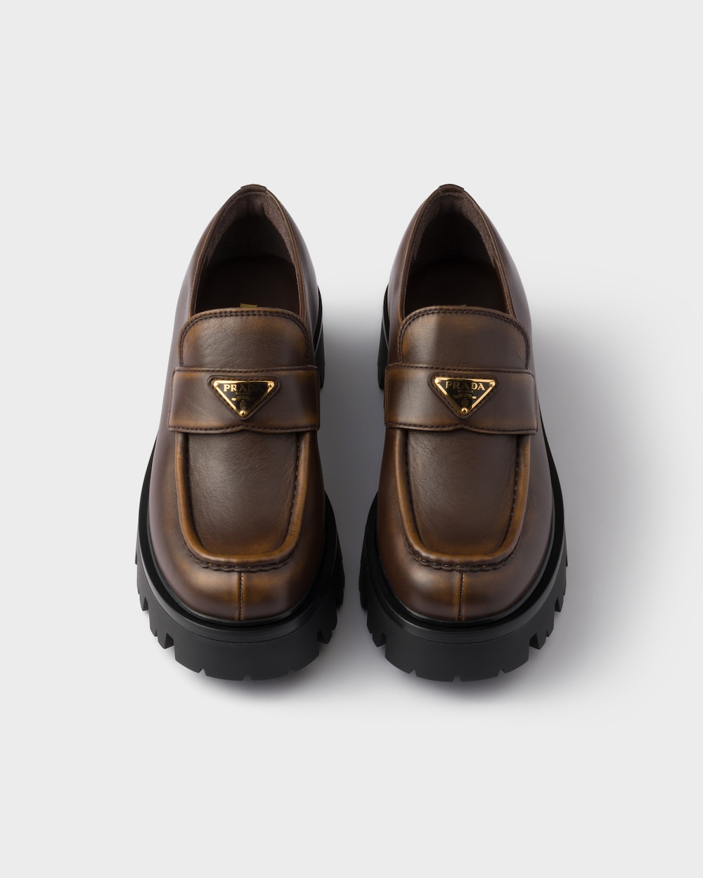 ヴィンテージ風レザーを使用したローファーは、クラシックなデザインに現代的なボリューム感を融合させた一足です。軽量でありながら耐久性に優れたラバー製のチャンキーソールが特徴で、トライアングルロゴをあしらった職人技のディテールが、全体のデザインを完成させています。