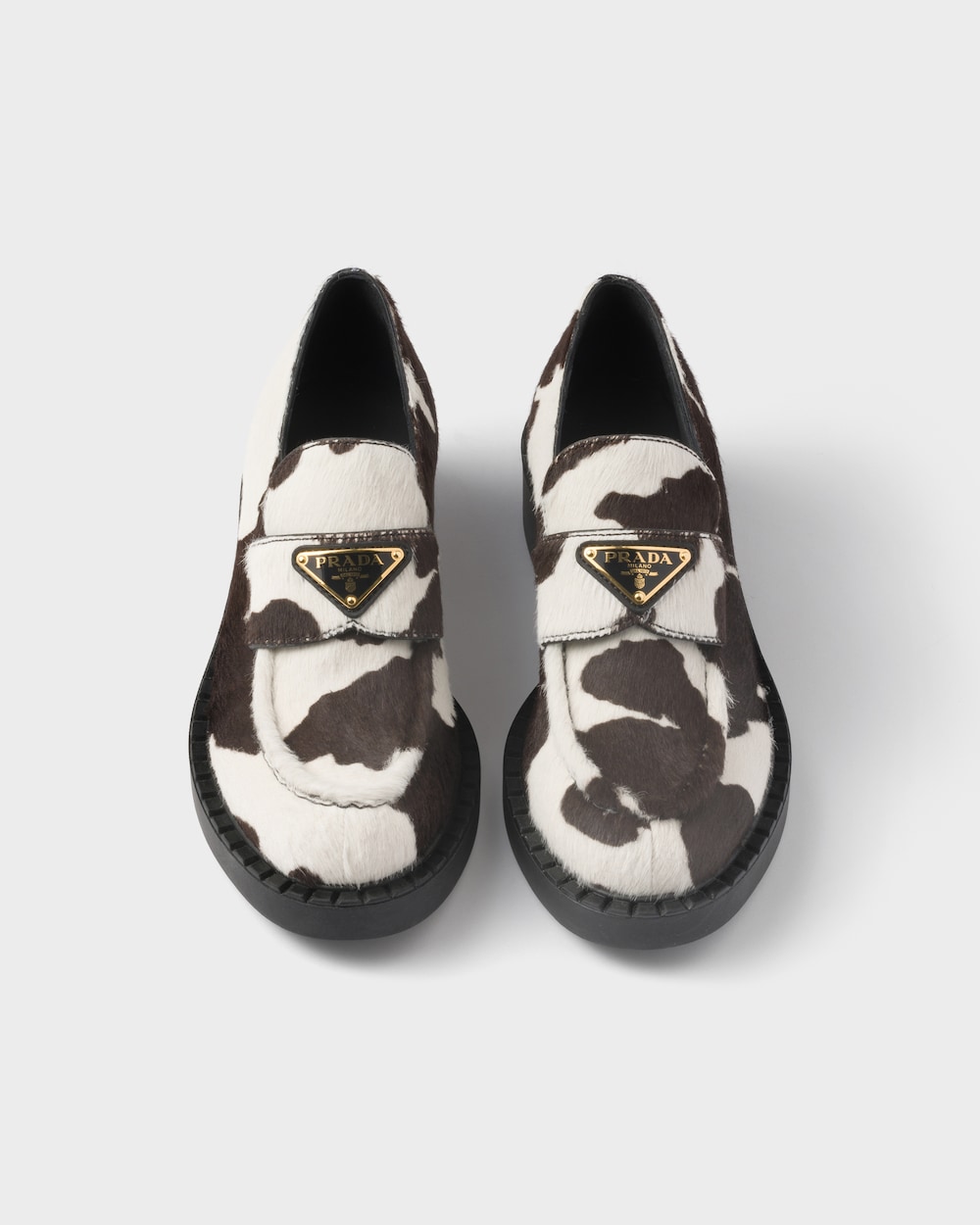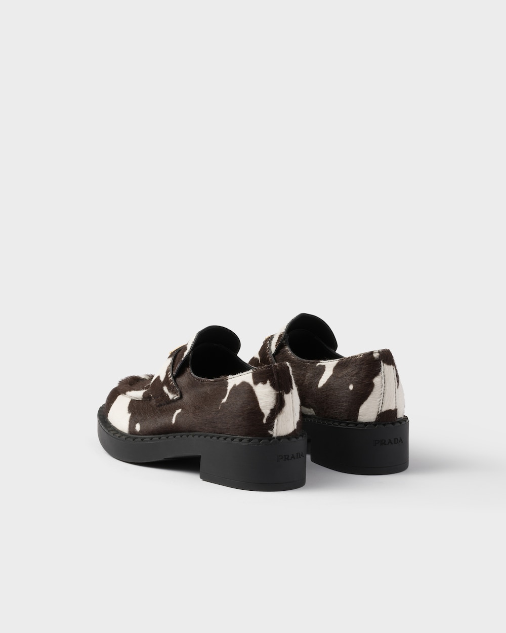 チョコレートカラーのローファーは、プラダの世界を象徴する独自のデザインであり、汎用性が高く洗練されたスタイルを体現しています。このハイブリッドなシルエットは、クラシックな素材とディテールを、ラバーソールのモダンなボリューム感と組み合わせることで特徴づけられています。この新しい解釈では、シューズはレザー素材にアニマルプリントを施し、大胆でコンテンポラリーな印象を加えています。