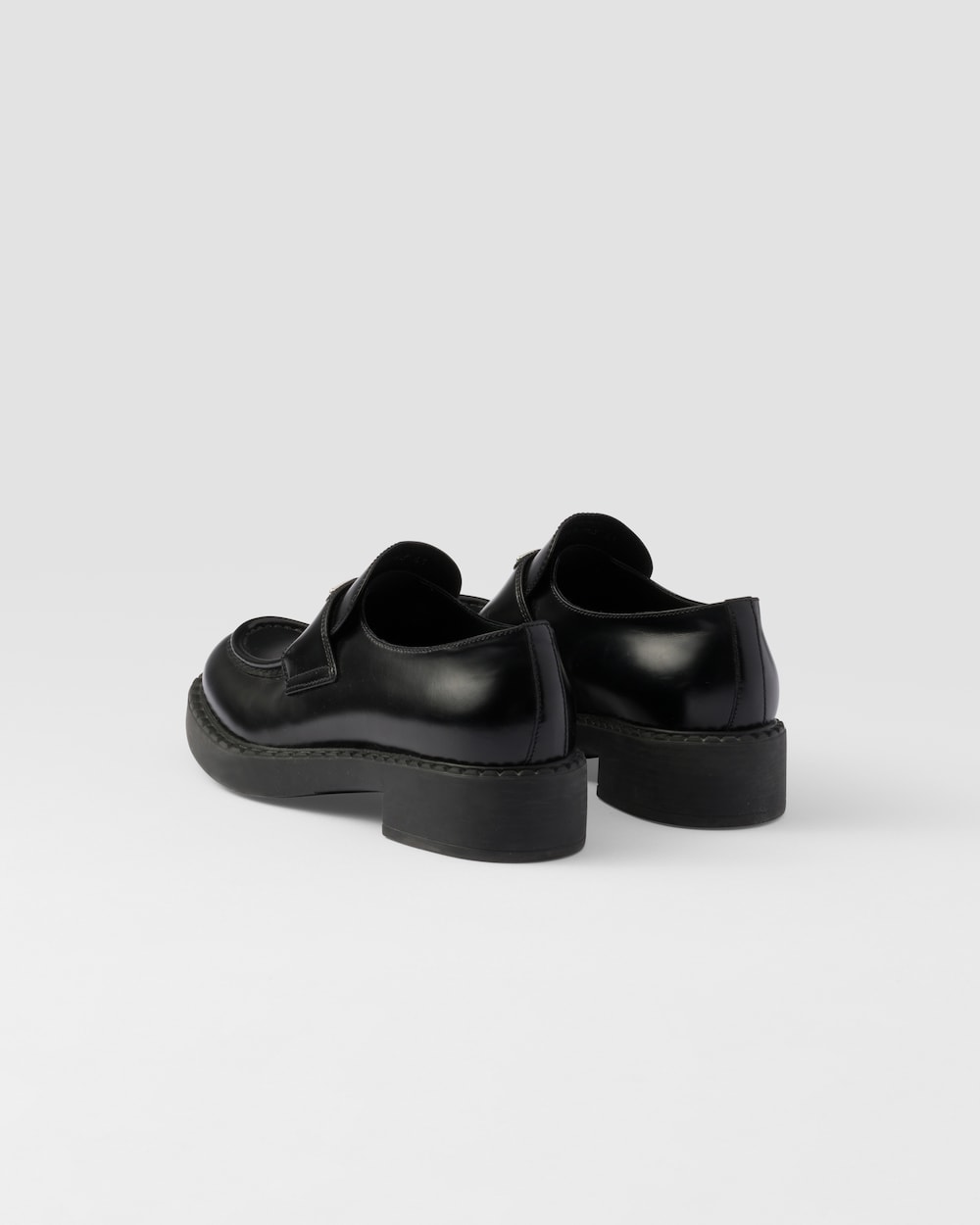 アイコニックなエナメル トライアングルロゴが際立つローファー。クラシックなラグジュアリーシューズに伝統的に使用されてきたブラッシュドレザー(牛革)をプラダのコレクションで再解釈し、ブランドの二元性が反映された意外性のあるハイブリッドなデザイン。ノッチドウェルトがハンドクラフトのアクセントを添えるアイテム。