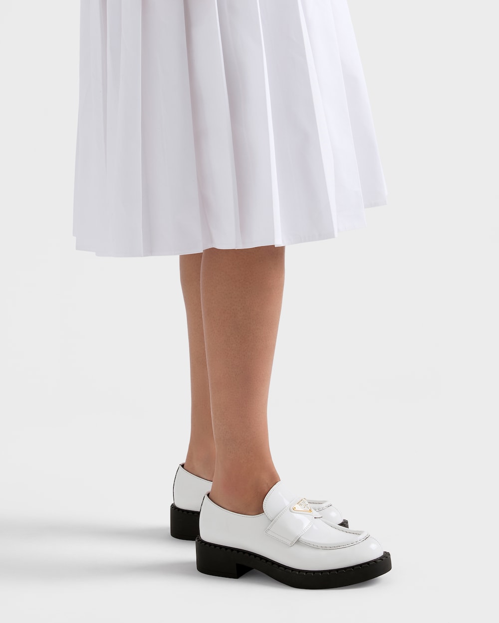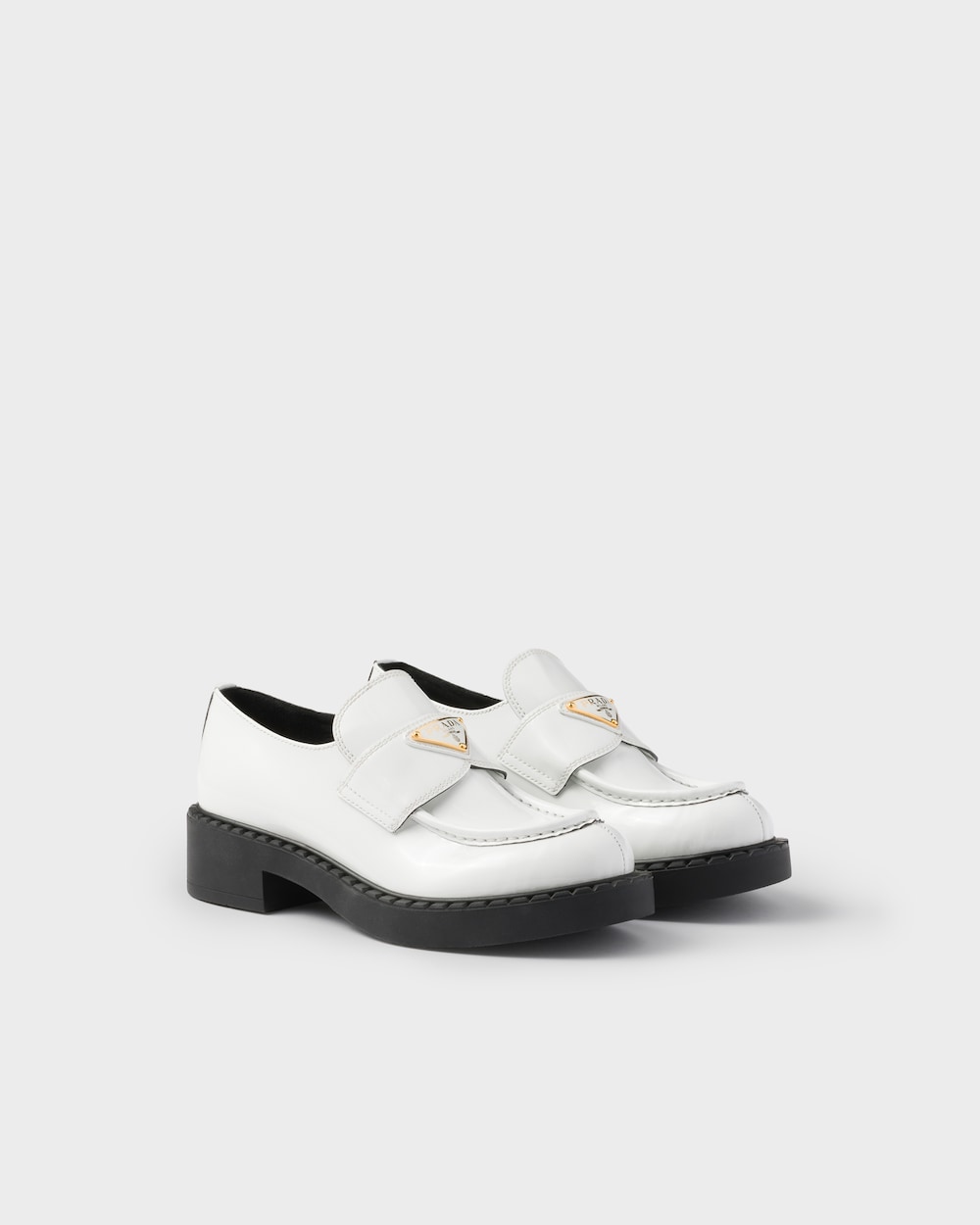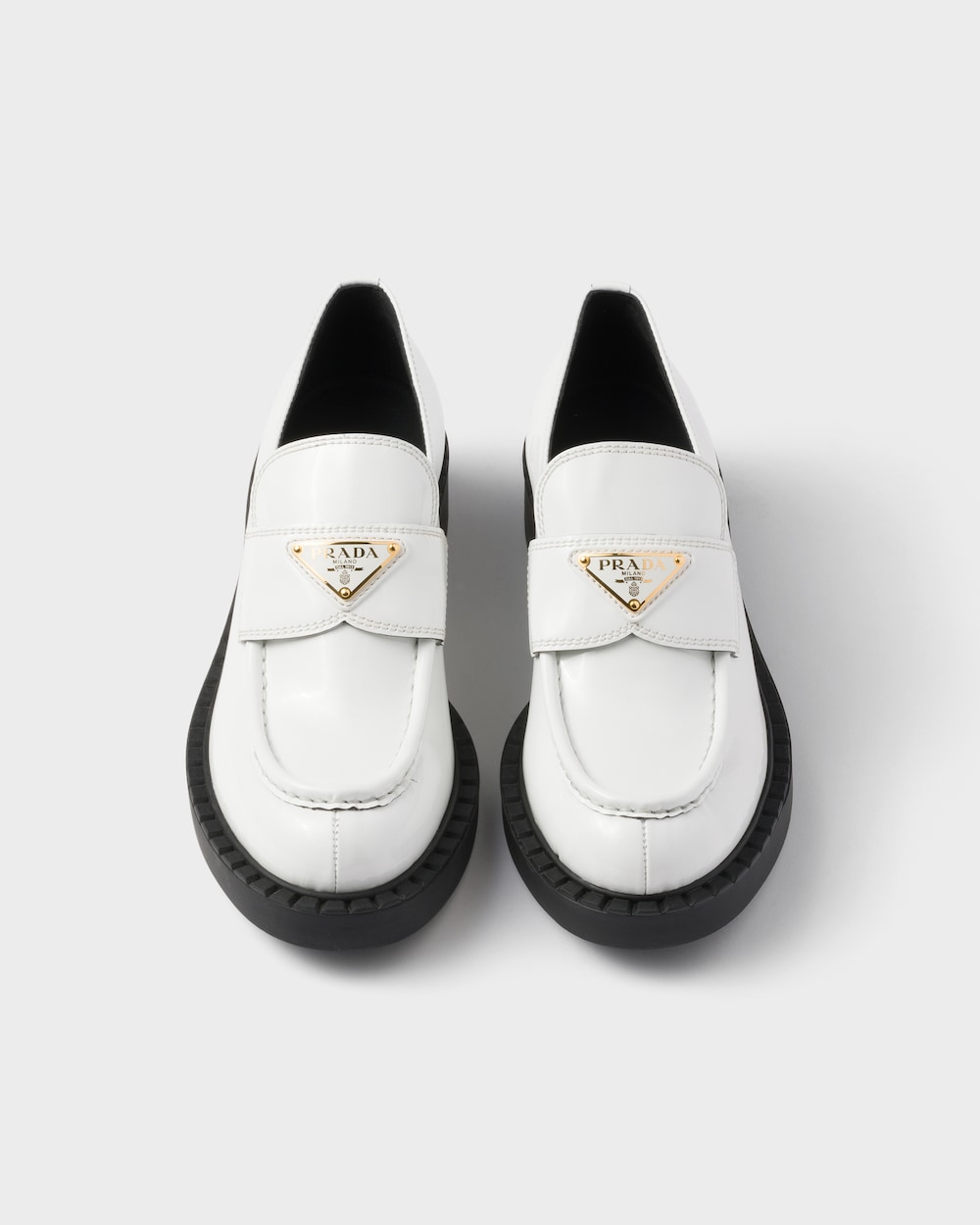 チョコレートカラーのローファーは、プラダの世界を象徴する個性的なデザインであり、汎用性と洗練を兼ね備えたスタイルを体現しています。このハイブリッドなシルエットは、クラシックな素材やディテールと、ラバーソールのモダンなボリューム感との対比によって特徴づけられています。パテントレザーのエレガントで艶やかな仕上げが、象徴的なエナメル加工のメタルトライアングルロゴによって完成されたスタイルに深みを与えています。