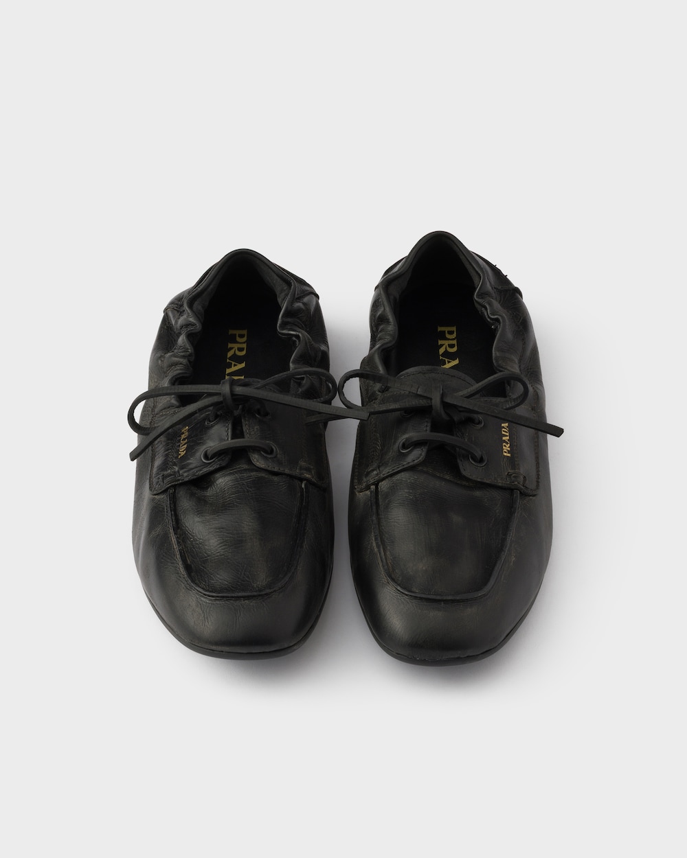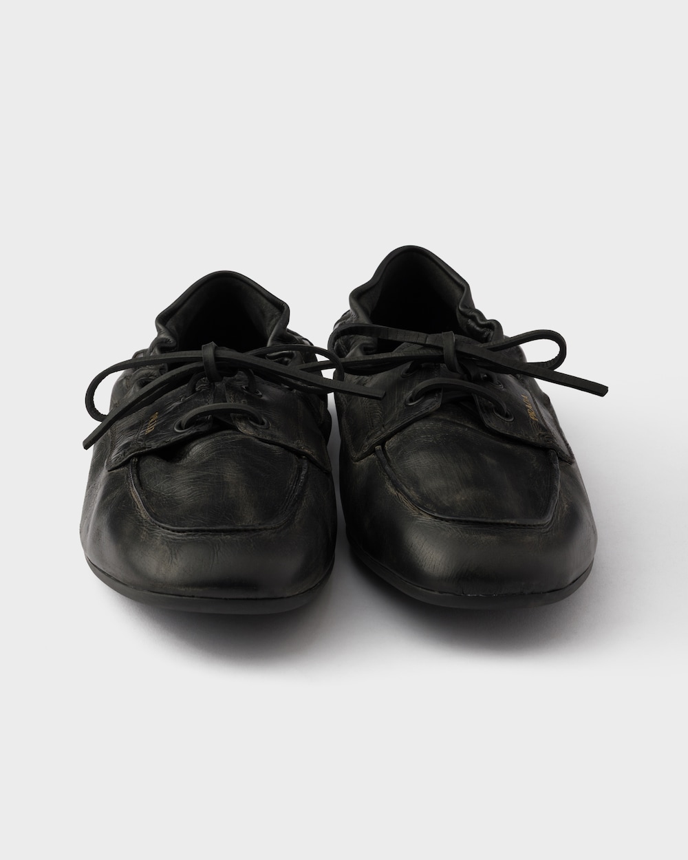デッキシューズ、フォーマルなスタイルのクラシックアイテムが、革新的で完全なデコンストラクテッドザインで再解釈されました。シューレースクロージャーのシューズは、軽量で柔らかく、柔軟なシルエットを好むフットウェアの構造の進化を表現しています。ヴィンテージ加工を施したアンティークレザーを使用した、洗練されたラインのデッキシューズ。上品なレタリングロゴがあしらわれています。