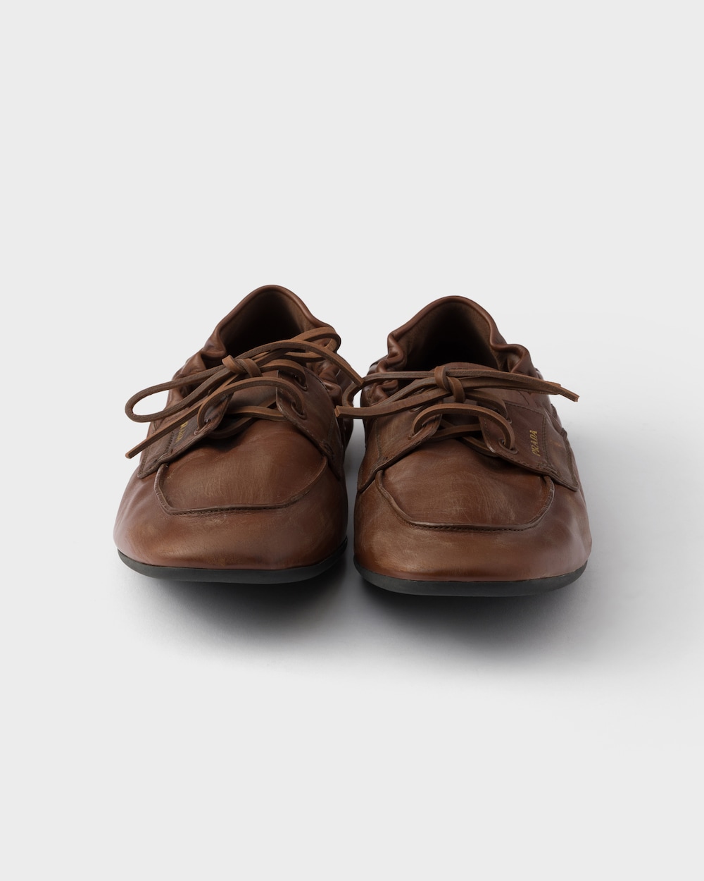 デッキシューズ、フォーマルなスタイルのクラシックアイテムが、革新的で完全なデコンストラクテッドザインで再解釈されました。シューレースクロージャーのシューズは、軽量で柔らかく、柔軟なシルエットを好むフットウェアの構造の進化を表現しています。ヴィンテージ加工を施したアンティークレザーを使用した、洗練されたラインのデッキシューズ。上品なレタリングロゴがあしらわれています。