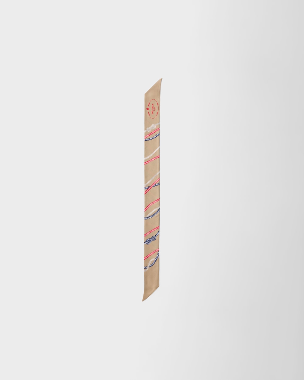 プラダの伝統にインスパイアされた、ロープとノットのプリントがエレガントに飾るツイルのスキニースカーフ。
