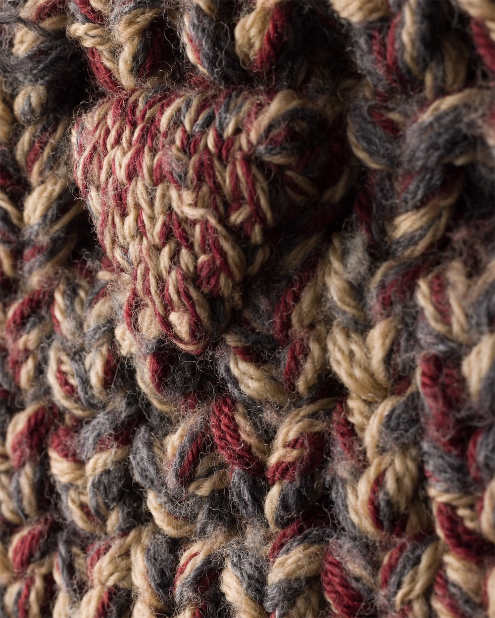フィッシャーマンリブ編みでメランジウールの襟が、ニットに独特で洗練された印象を与えてます。同色のニットで作られたトライアングルロゴが飾られています。