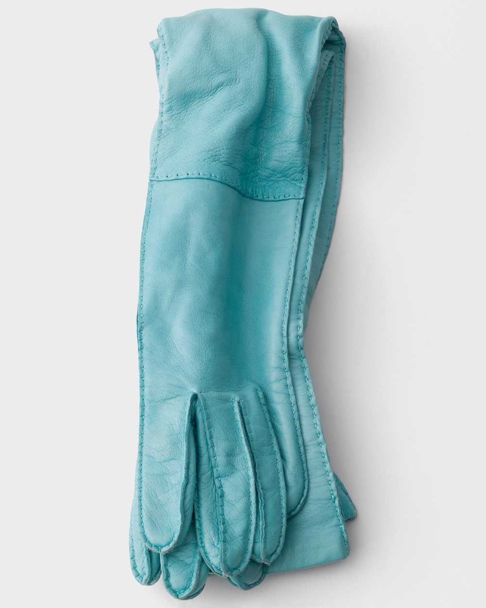 カラフルなナッパ(羊革)のロングフィットグローブ。リストにスリット入り。ボタンディテールをあしらったデザイン。