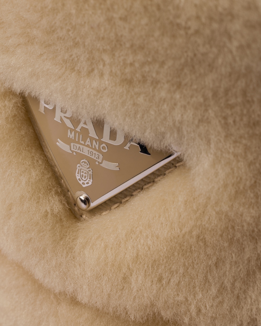 プラダコレクションを象徴するバケットハット。シアリングを使用、エナメルメタルのトライアングルロゴがあしらわれています。