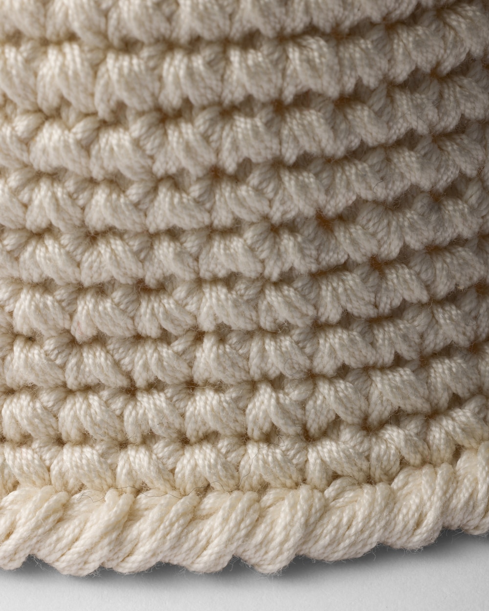都会的なスタイルをライトなクロシェ編みのモチーフでアレンジ。エナメルメタルのトライアングルロゴを飾って仕上げたアイコニックなバケットハット。