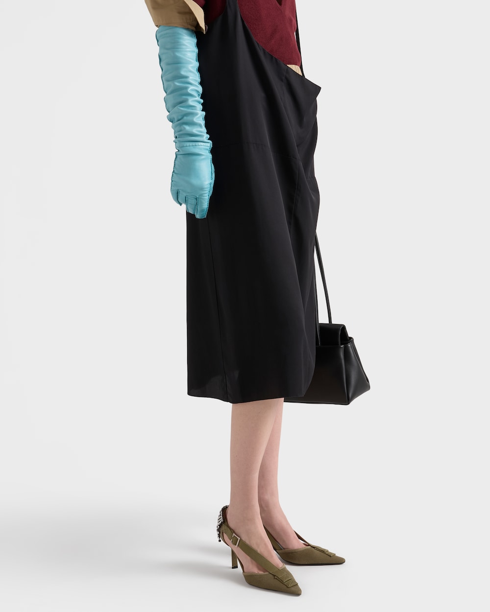 ユーティリティスタイルと装飾性、厳格さと華やかさを融合させたこれらのパンプスは、コントラストを探求した結果の結晶です。1990年代の女性らしいシルエットと、キャンバスの実用的でカジュアルな質感の間に意外な調和が生まれます。特徴的な幾何学的ヒールがシューズ全体を完成させ、輝くクリスタルのカスケードで装飾されています。