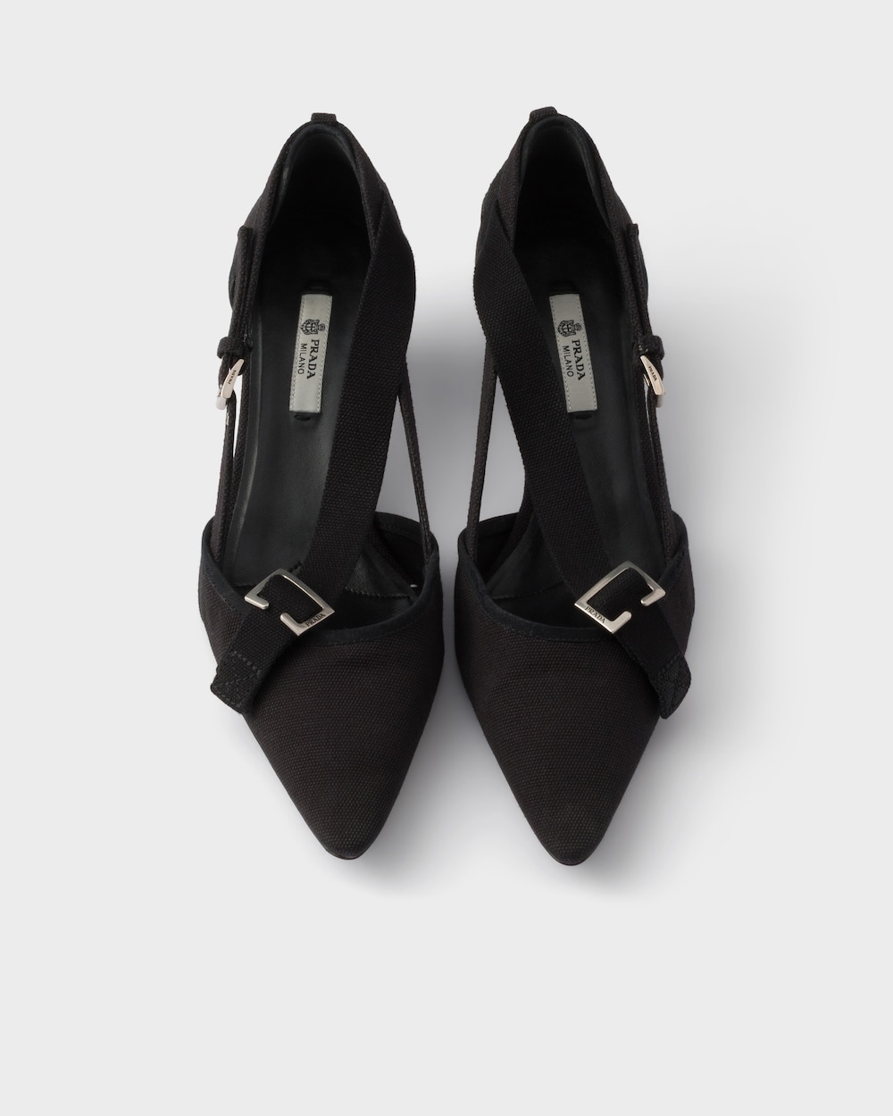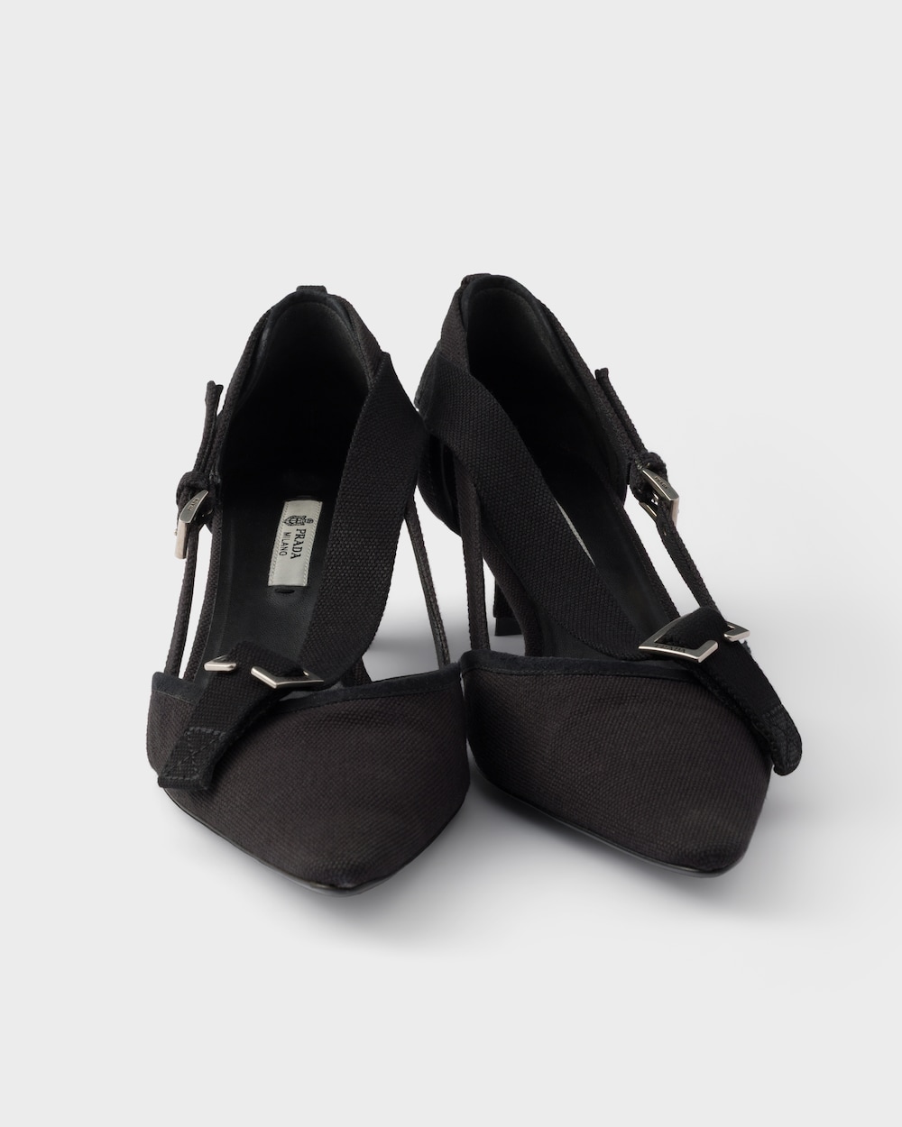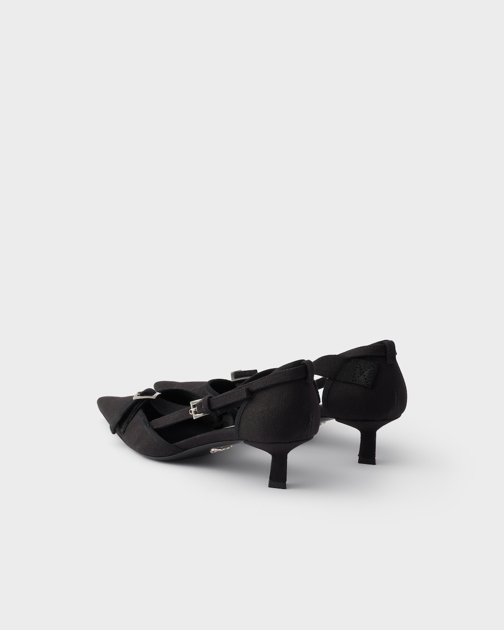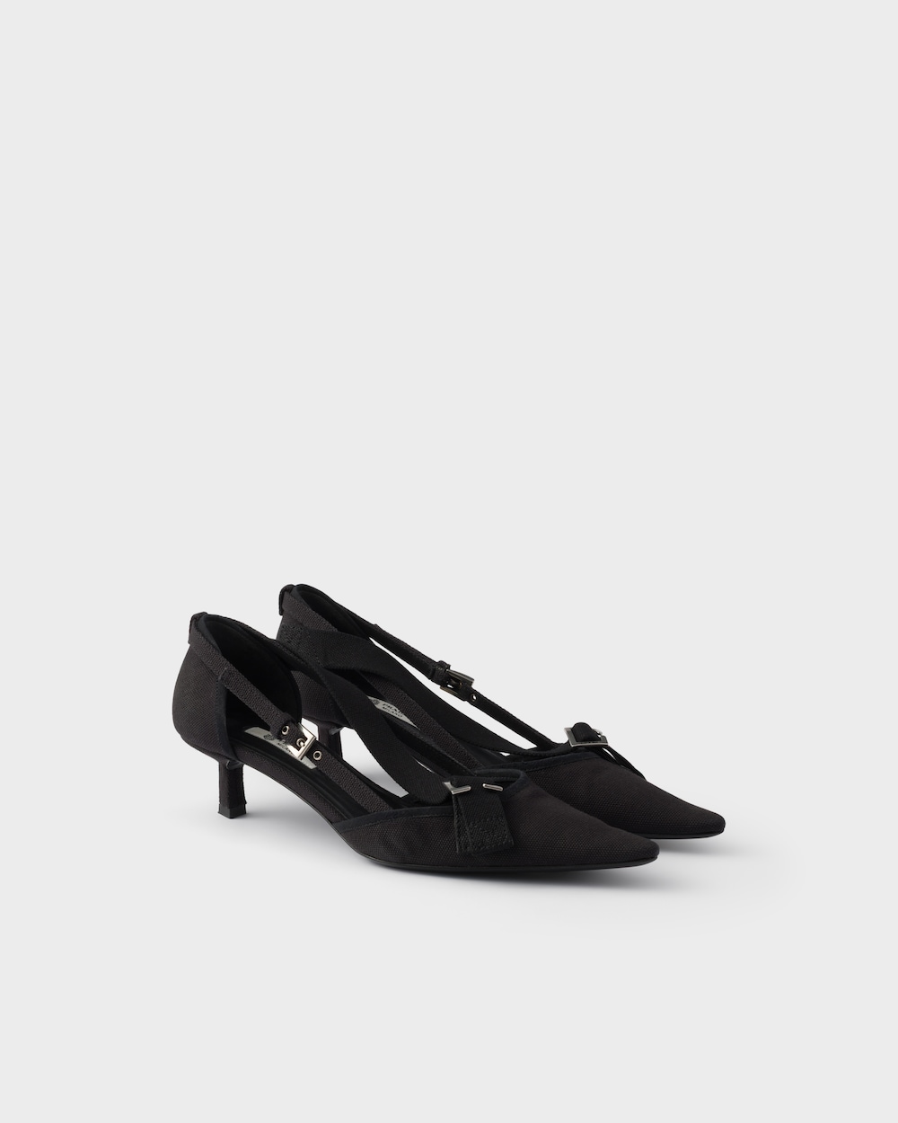 ユーティリティスタイルと装飾性、厳格さと華やかさを融合させたこれらのパンプスは、コントラストを探求した結果の結晶です。女性らしいシルエットとキャンバスの実用的でカジュアルな質感の間に、意外な調和が生まれています。特徴的な幾何学的なキトゥンヒールがシューズを完成させ、デザインの型破りな性質を際立たせるメタルバックルで装飾されています。