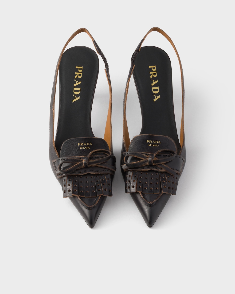 力強いラインと大胆なディテールが、女性らしさの象徴であるスリングバックパンプスを独創的で型破りなデザインに変えます。アンティークレザーのポインテッドトゥシルエットにフリンジのディテールが施されています。洗練されたキトゥンヒールが、先細のシューズを完成させ、多面的なスタイルを表現します。