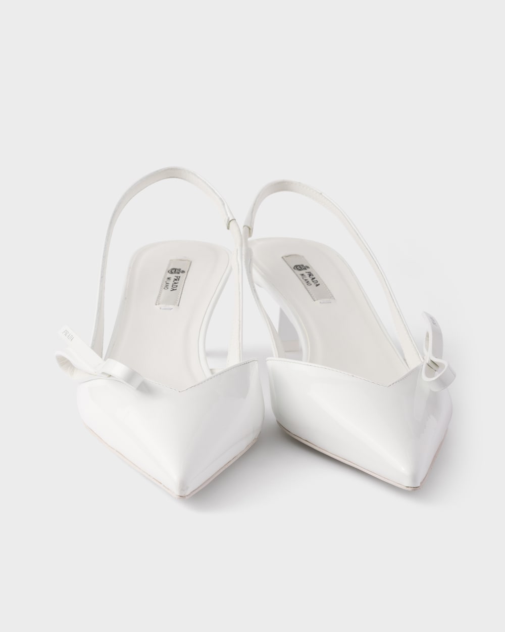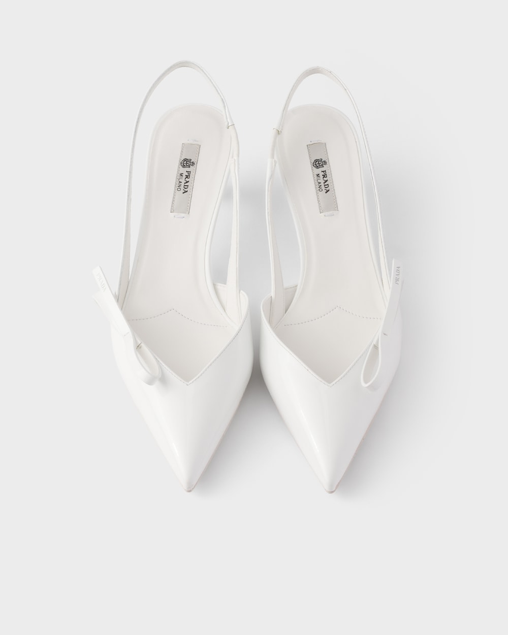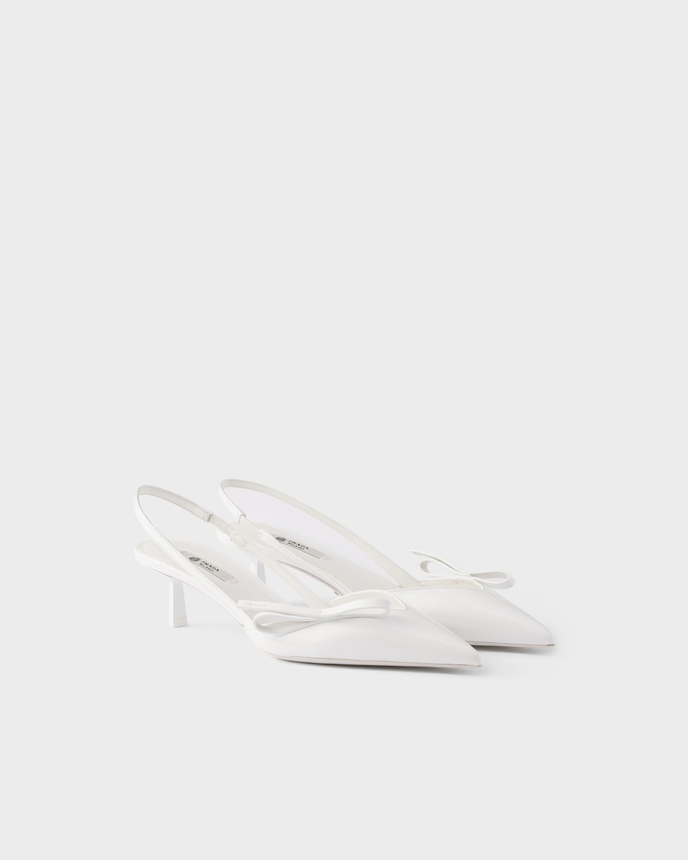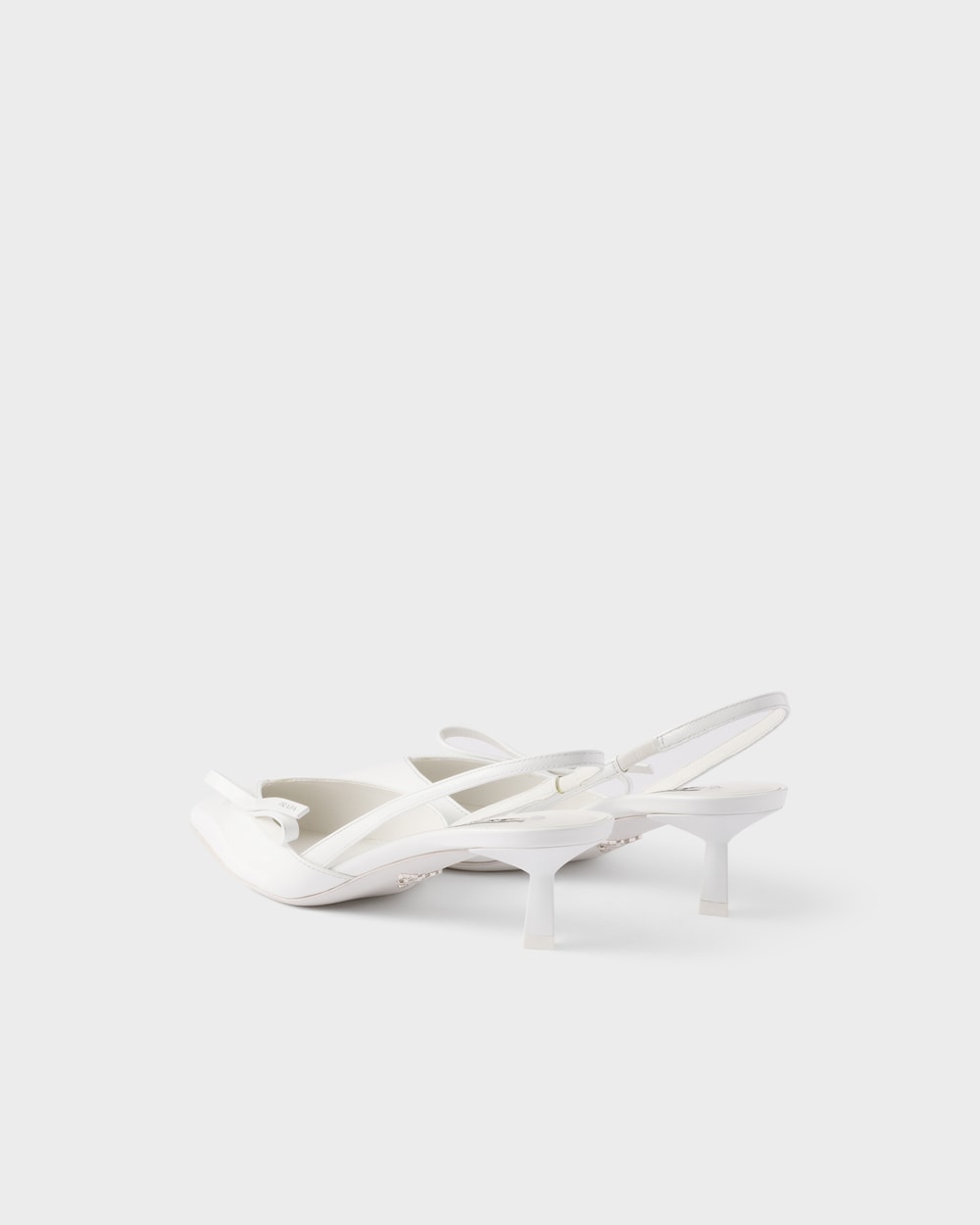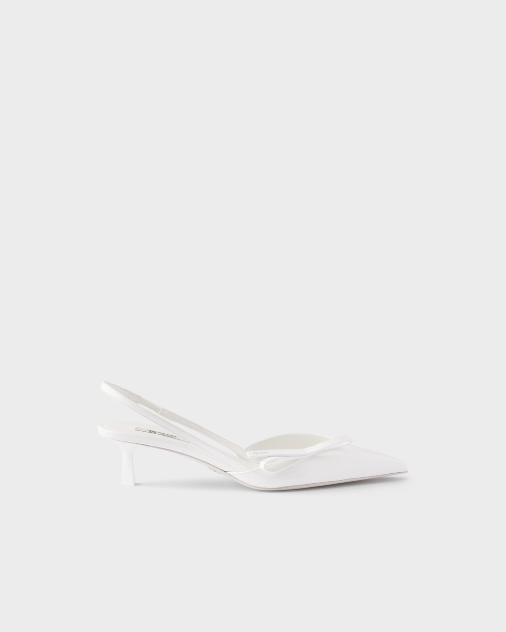 これらのスリングバックパンプスは、正確で女性らしい細身のラインを備え、純粋で現代的なエレガンスを体現しています。パテントレザー(牛革)のシューズは、軽やかなポインテッドトゥのシルエットに、シンプルで洗練されたリボンがあしらわれています。幾何学的なキトゥンヒールは、象徴的なプラダトライアングルにインスパイアされ、洗練されたデザインを完成させます。