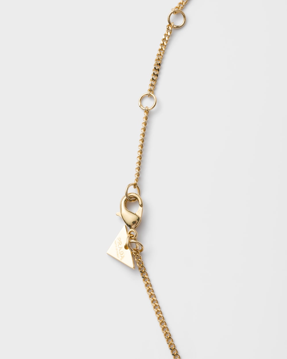 プラダコレクションのシグネチャー要素であるトライアングルロゴが、独特なデザインのメタルネックレスを飾ります。