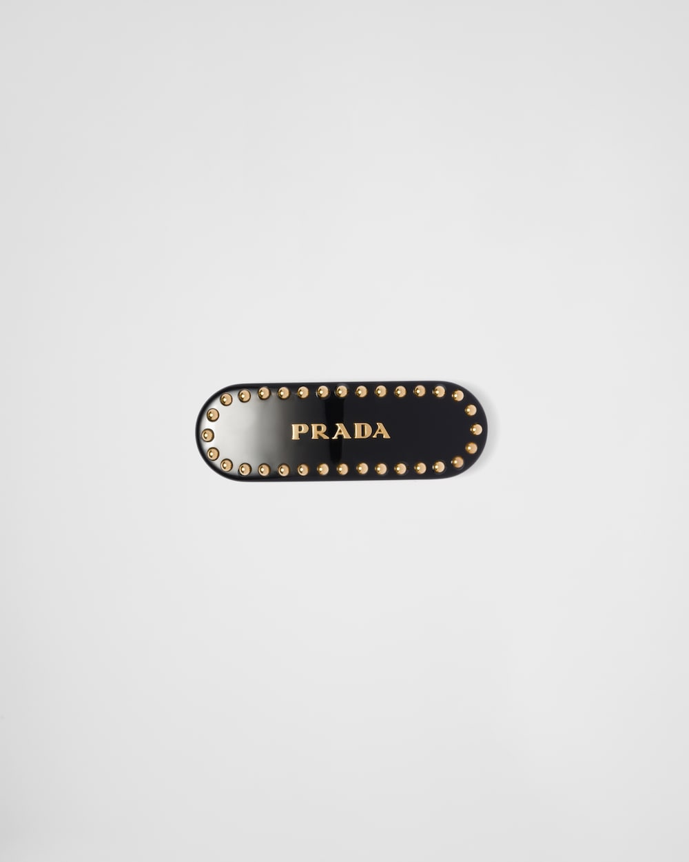 プラダロゴとメタルスタッズがあしらわれたヘアクリップ。