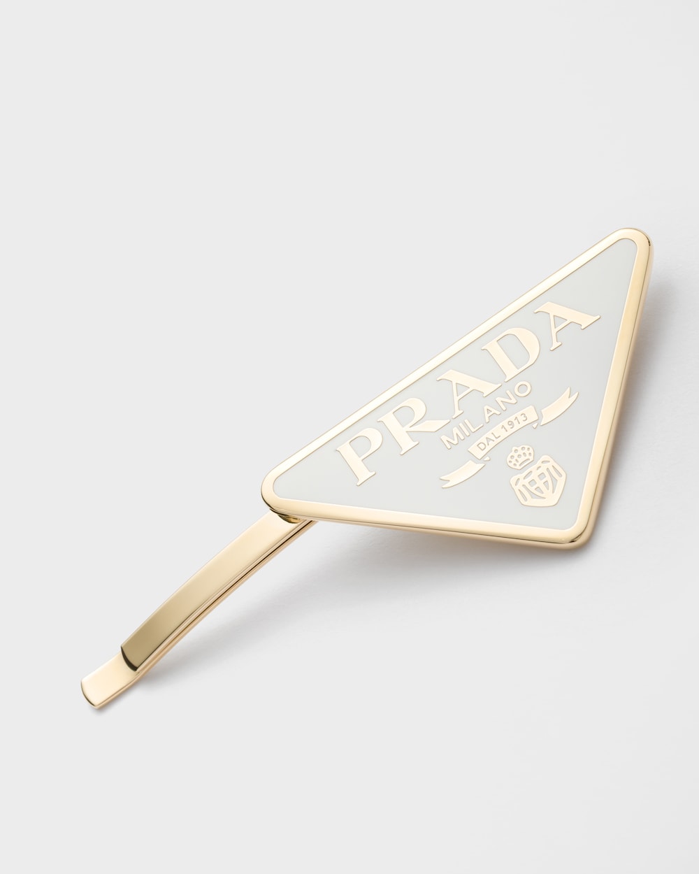 プラダを象徴する洗練された幾何学形を描くトライアングルロゴをあしらった、エナメルメタルのヘアピン。