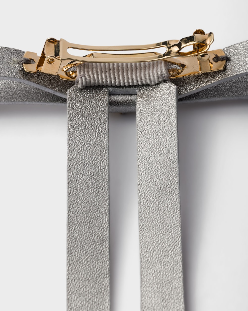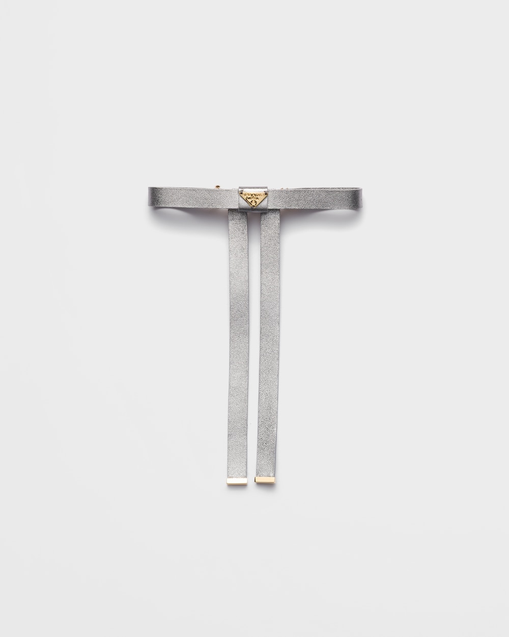 女性らしい洗練されたヘアリボンは、スリークでコンテンポラリーなデザインによって再解釈されています。ナッパレザー(羊革)を使用したアクセサリー。メタル トライアングルロゴがあしらわれています。
