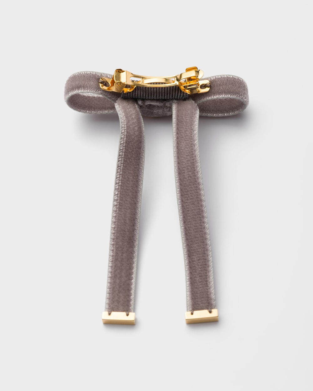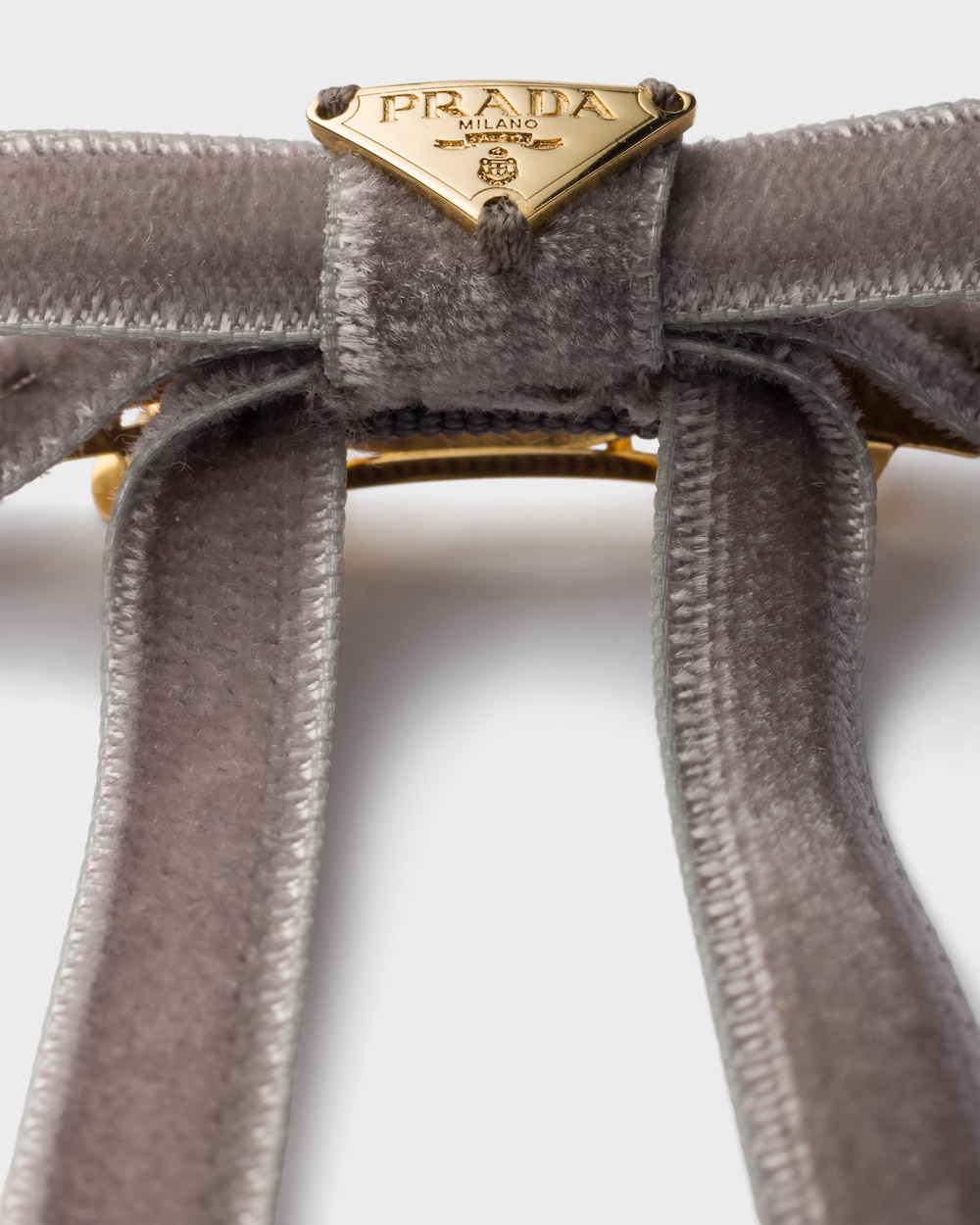 女性らしく洗練されたヘアリボンが、貴重で現代的なデザインで再解釈されています。ベルベットのアクセサリーにはメタル トライアングルロゴがあしらわれています。