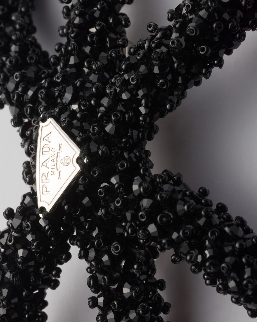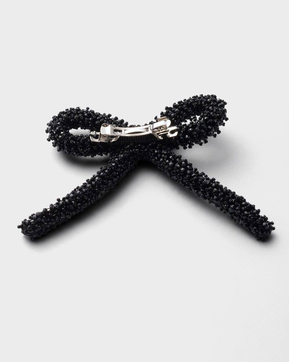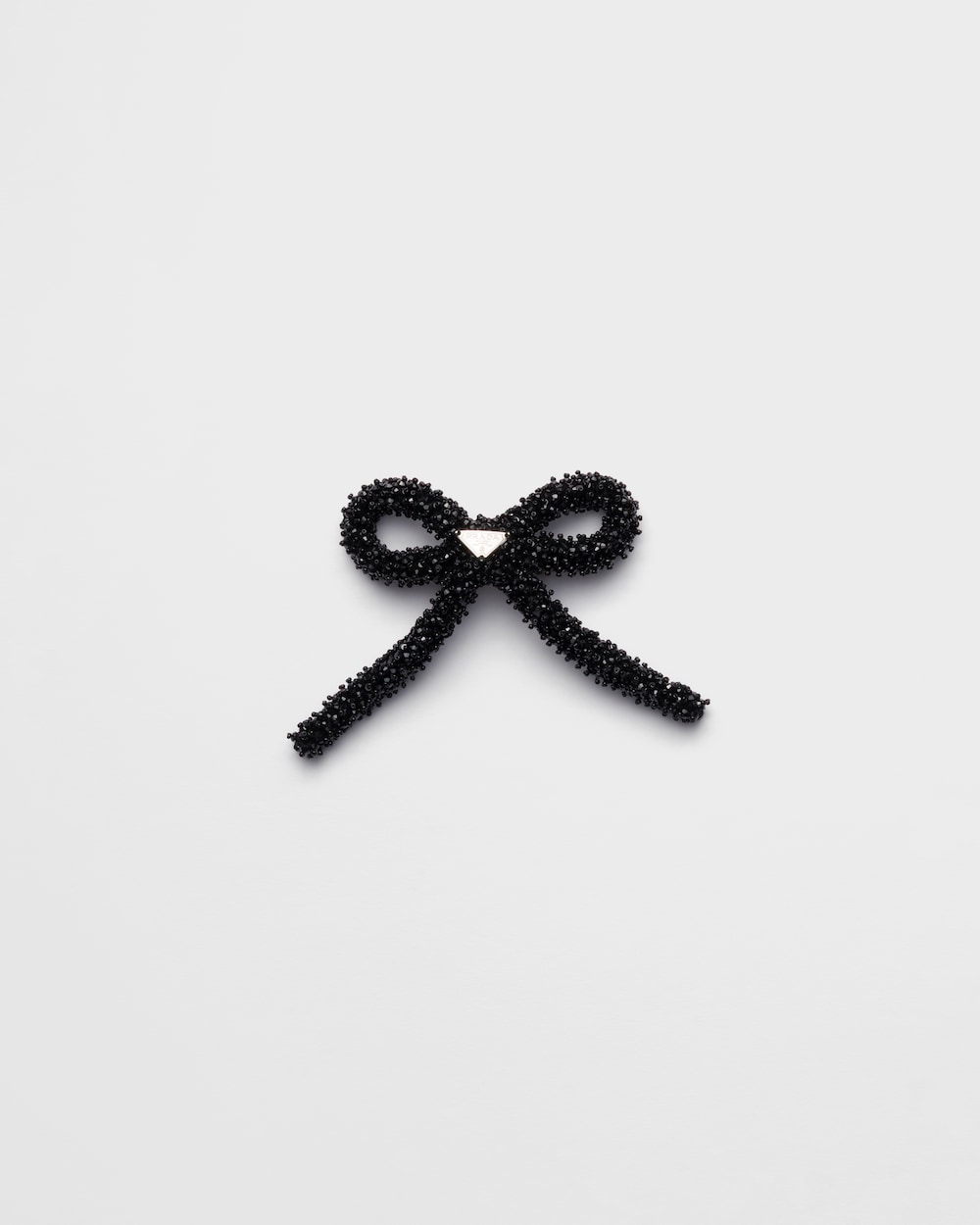 女性らしく洗練されたヘアリボンが、貴重で現代的なデザインで再解釈されています。クリスタルで立体的な効果を生み出したアクセサリー。エナメルメタルのトライアングルロゴがあしらわれています。