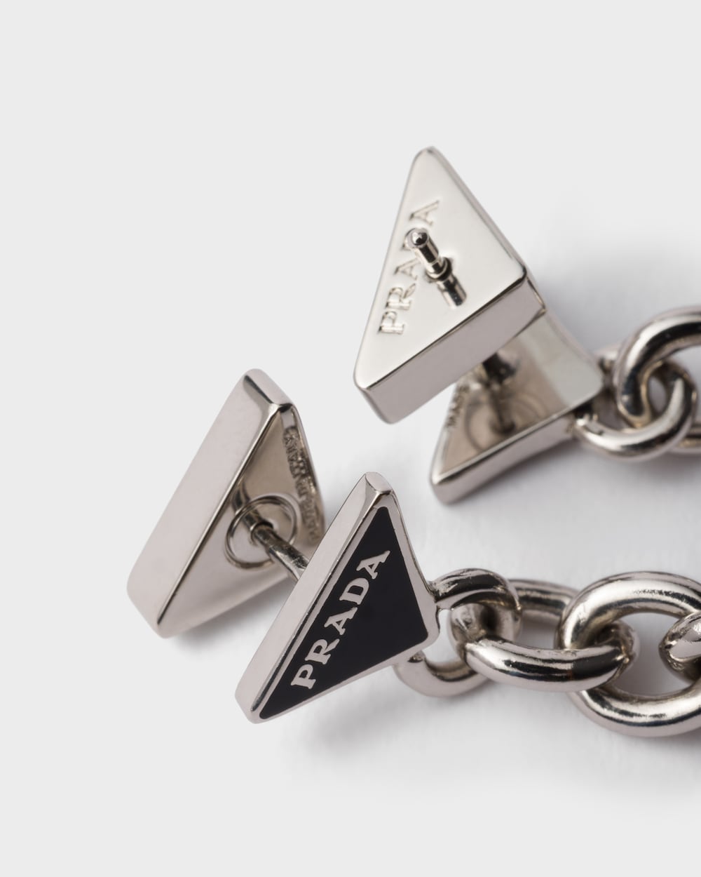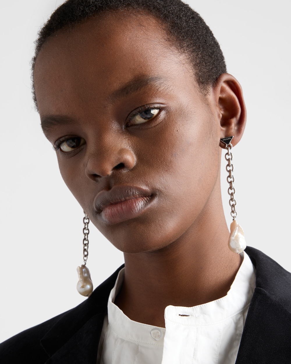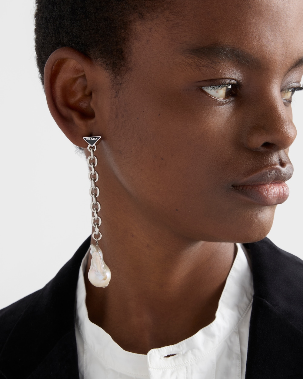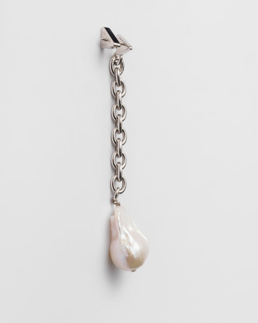 予想外の組み合わせとコントラストが形作るメタルピアス。バロックパールとアイコニックな幾何学形を描くトライアングルロゴで装飾されています。