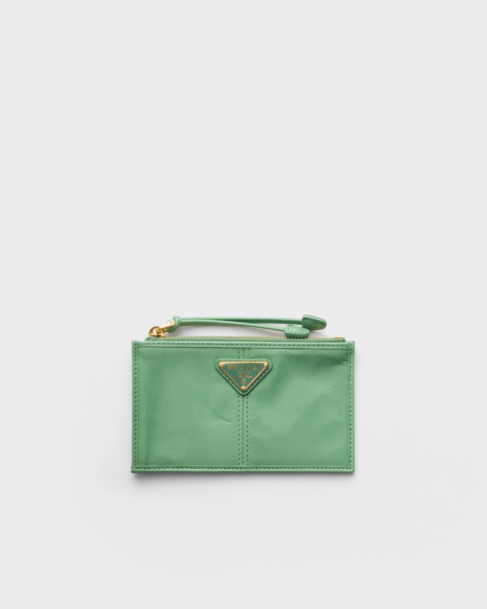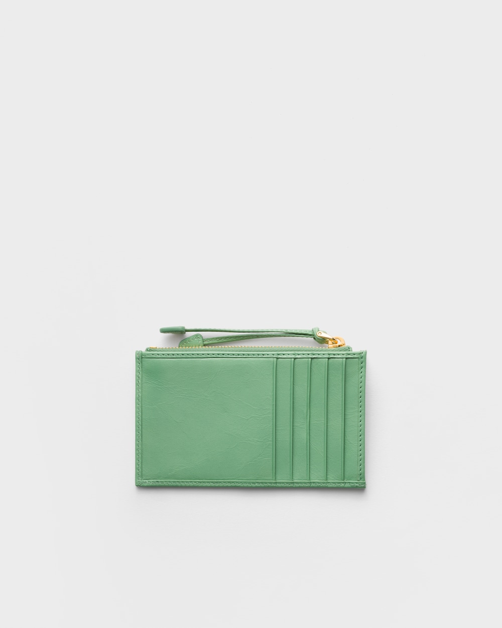 光沢仕上げの柔らかなレザーを使用し、洗練されたデザインを魅力的に引き立てたコンパクトで幅広い用途に使えるカードケース。ファスナー付ポケット1個と複数のカードホルダーを備え、アイコニックなエナメルメタルのトライアングルロゴがあしらわれています。