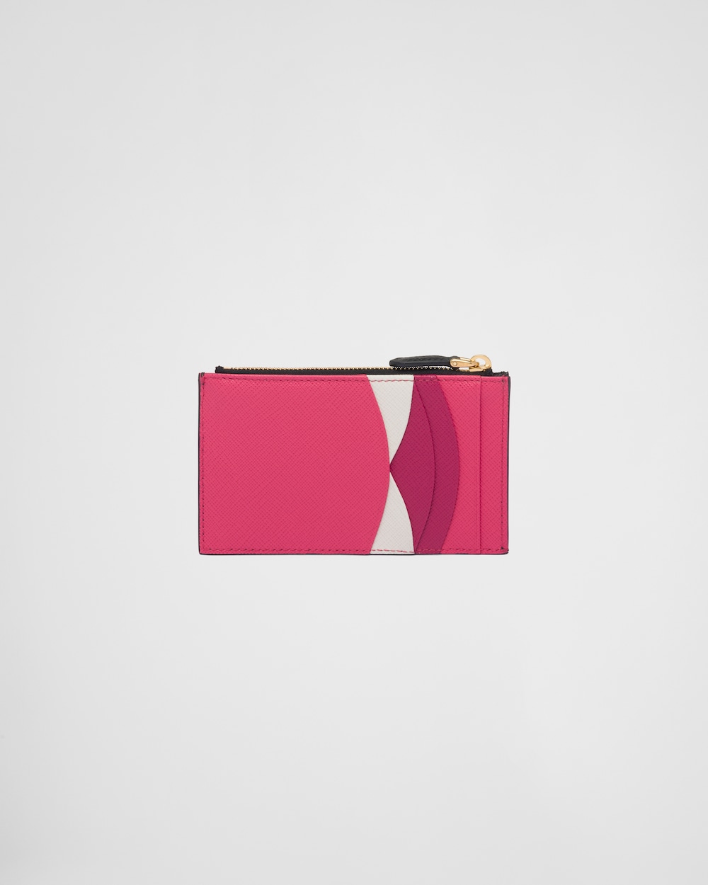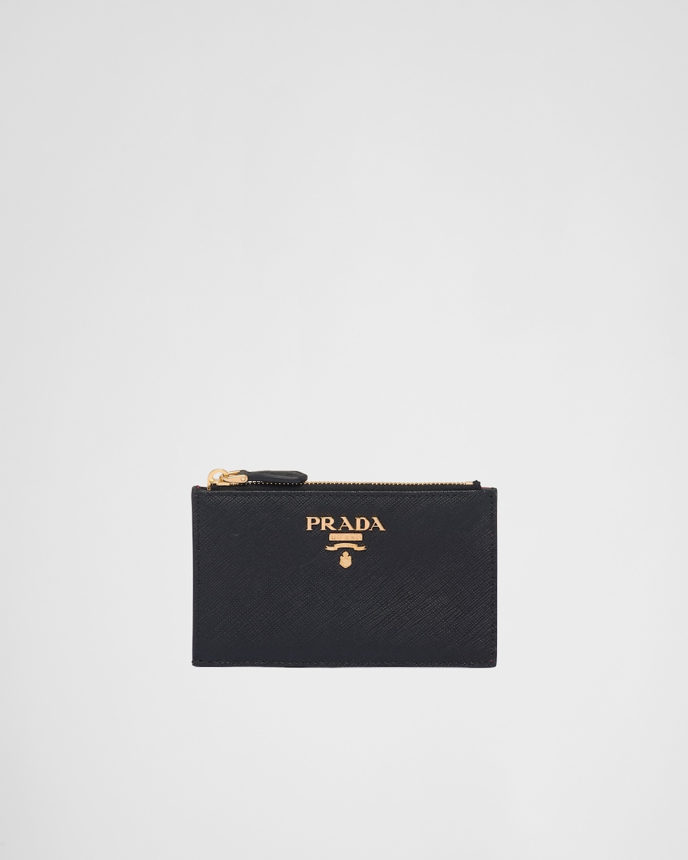 洗練されたラインが際立つカードケース。プラダを象徴する「サフィアーノ」レザー(牛革)に施された、クロスハッチ加工の独特な質感が特徴です。カードホルダーを5個備え、メタルのレタリングロゴがあしらわれています。
