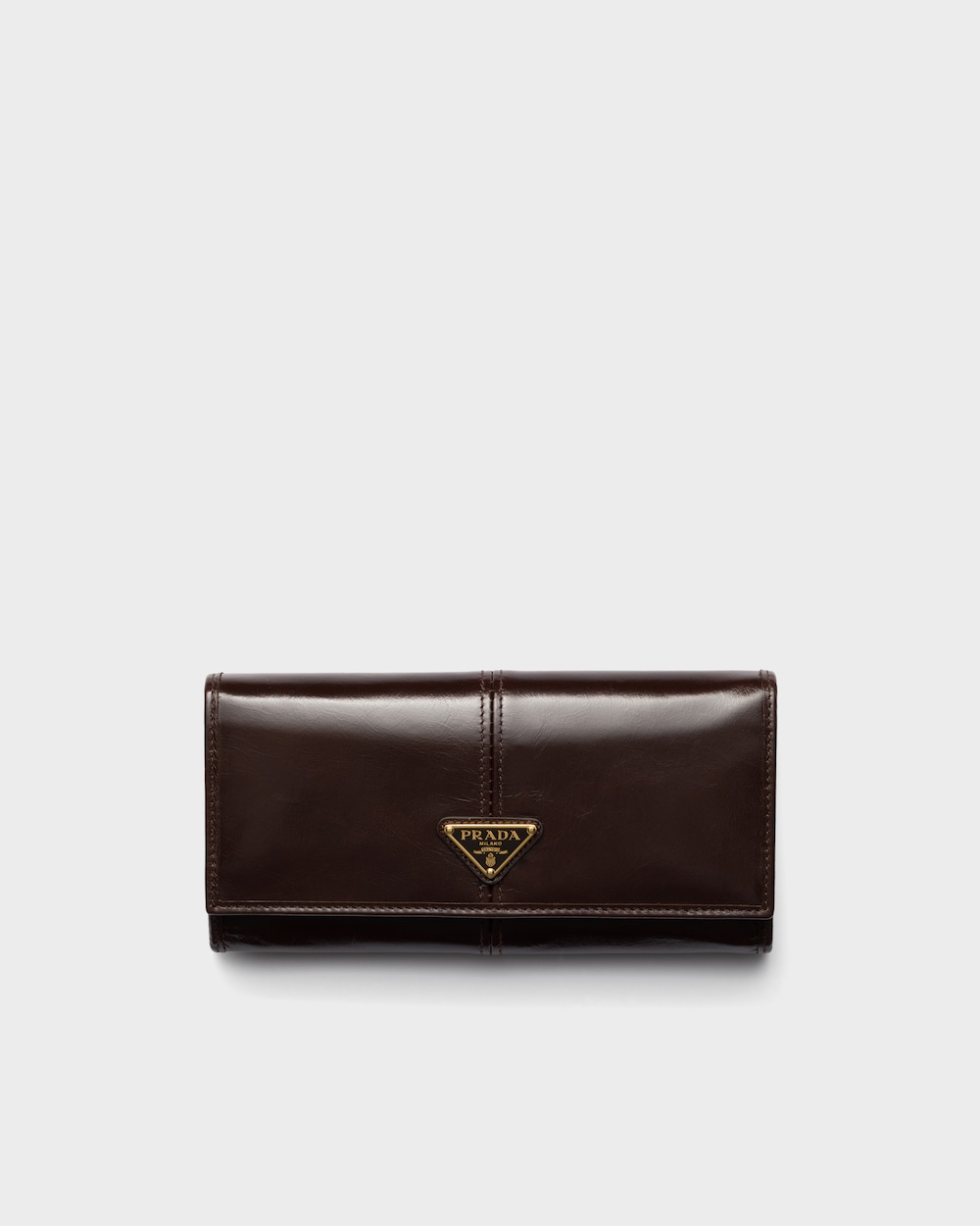上品なデザインが際立つ、ラージサイズのレザー財布。エナメルメタルのトライアングルロゴが洗練されたアクセントを添えています。内側に多数の収納部分が備わった、スナップボタン開閉式のデザイン。