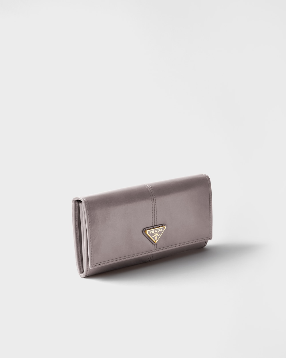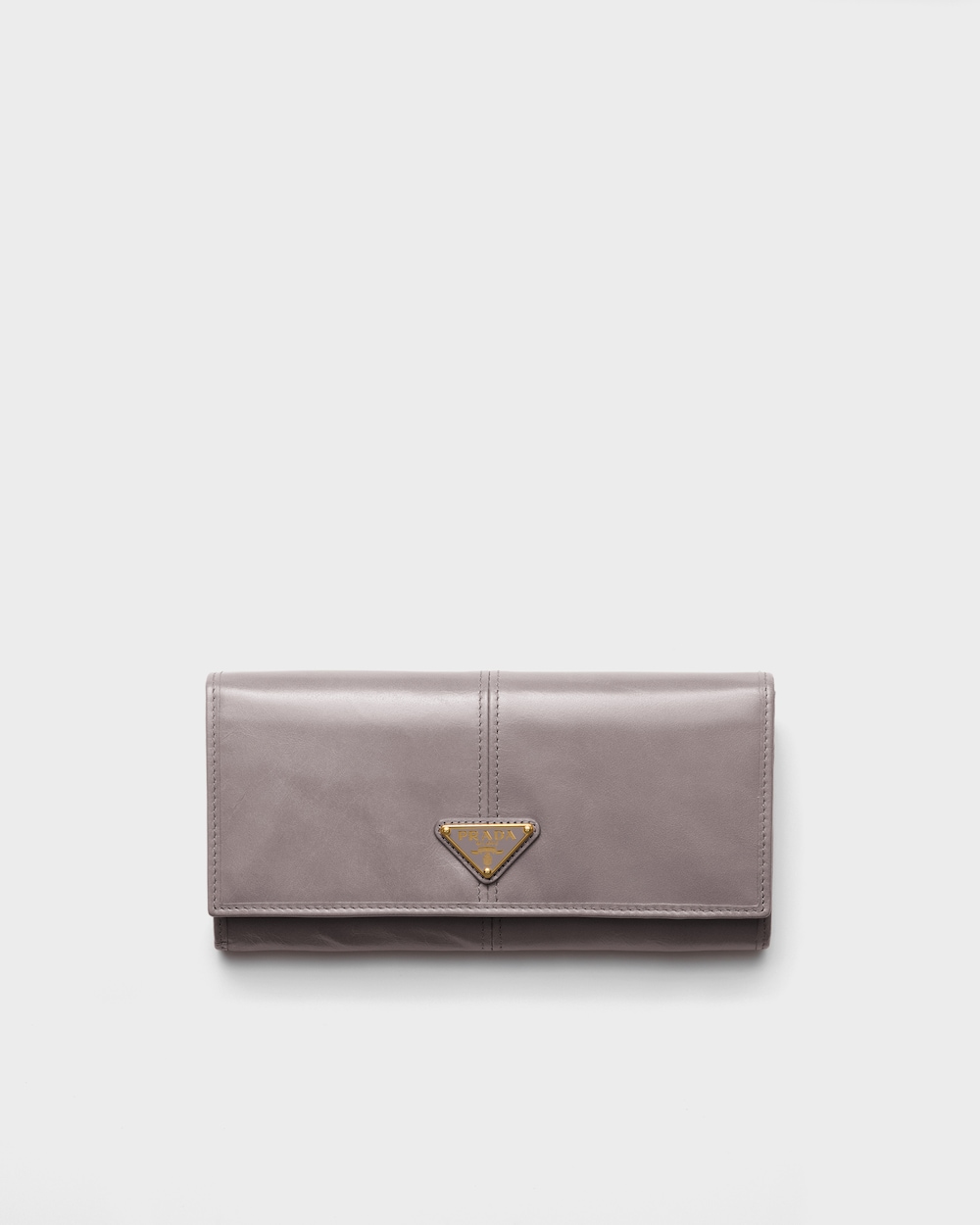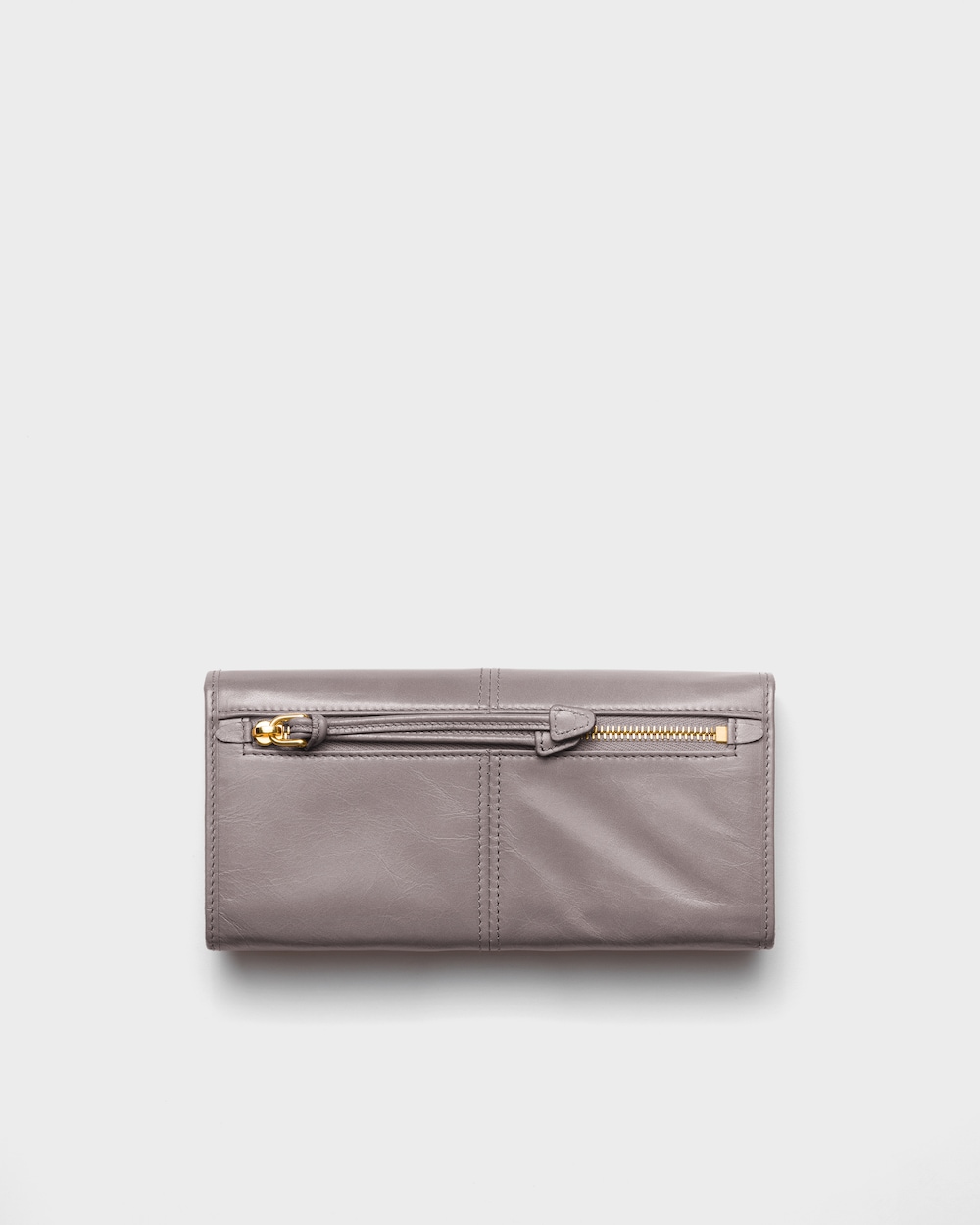 上品なデザインが際立つ、ラージサイズのレザー財布。エナメルメタルのトライアングルロゴが洗練されたアクセントを添えています。内側に多数の収納部分が備わった、スナップボタン開閉式のデザイン。